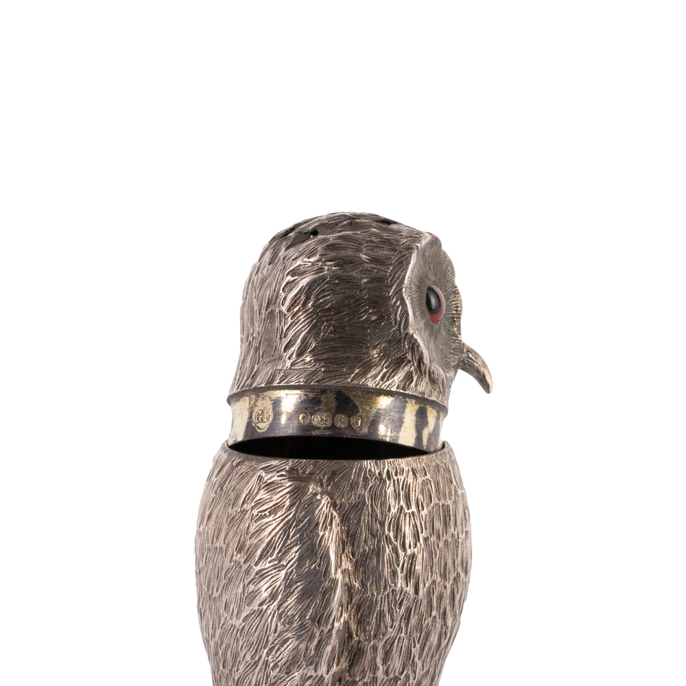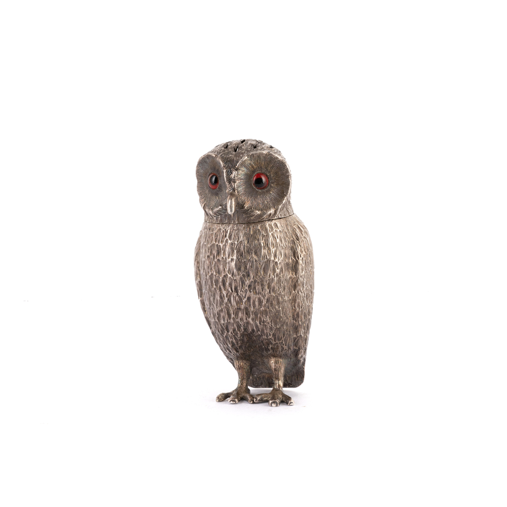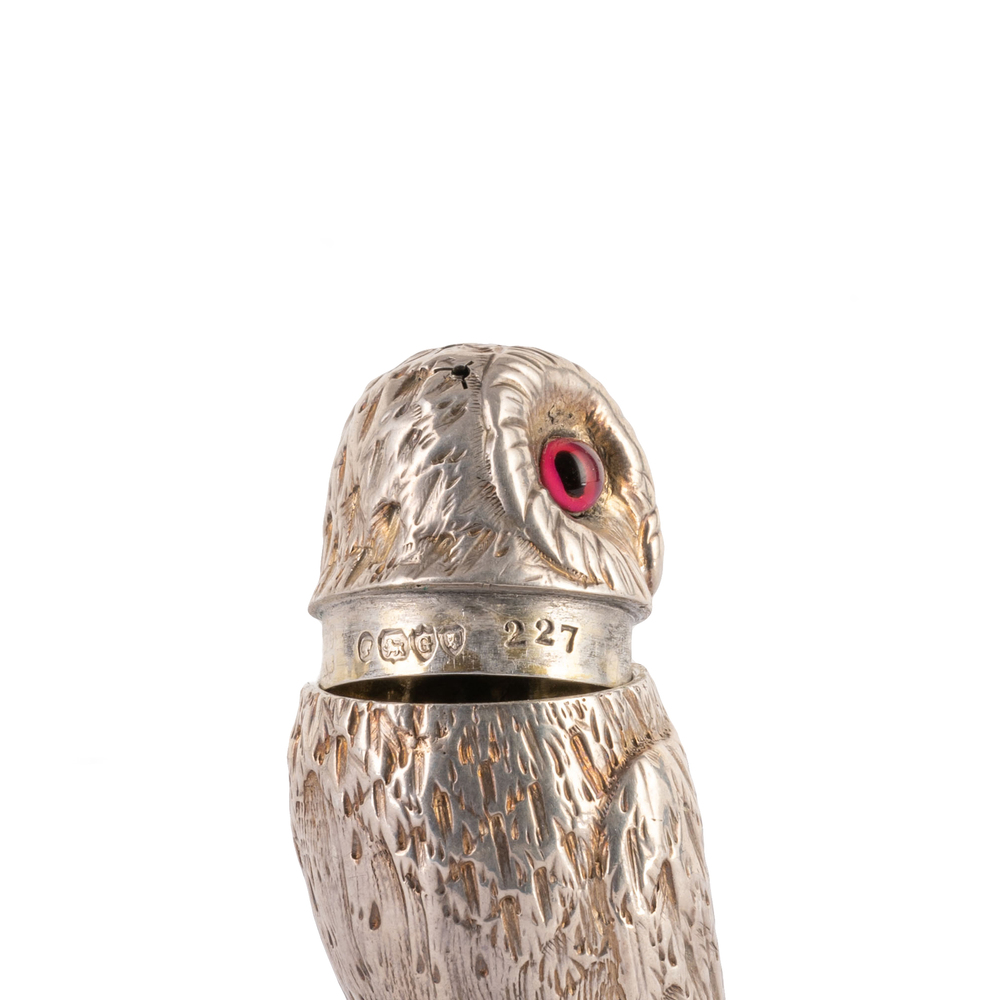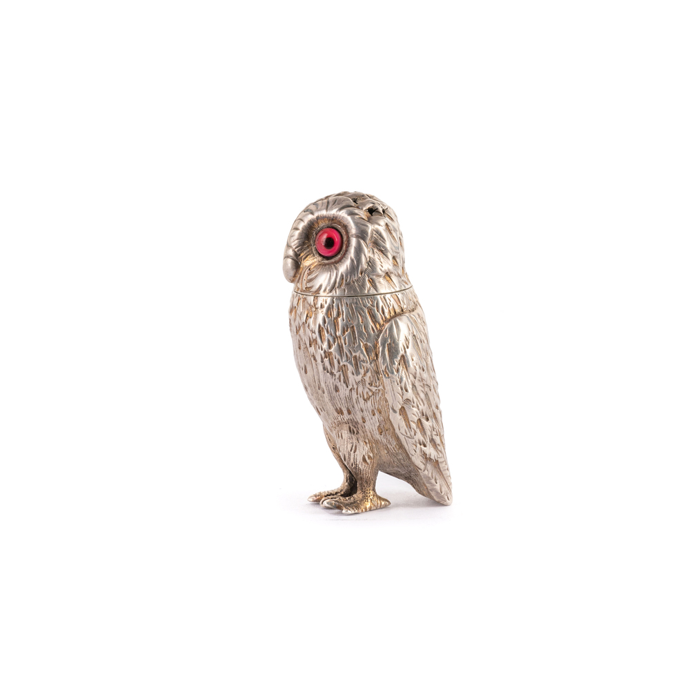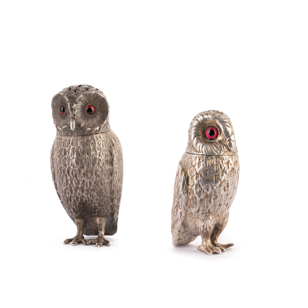 Due porta sale in argento a foggia di civetta con occhi in vetro incastonati, teste removibili