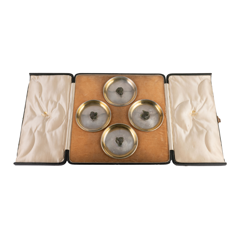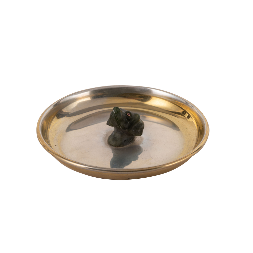 Corpi circolari con presa centrale rappresentata da teste di cane e volpe in pietra dura con occhi in zirconi incastonati.