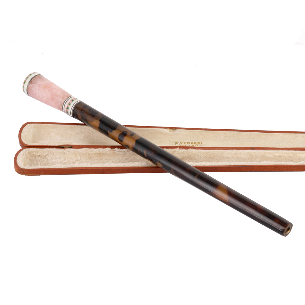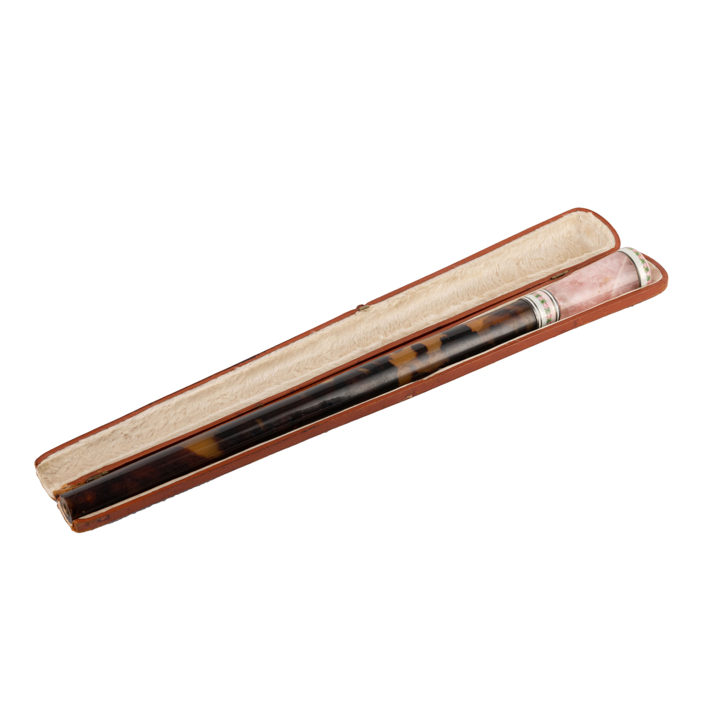 Umbrella handle in tortoiseshell, rose quartz and enamelled porcelain