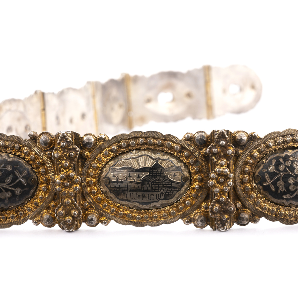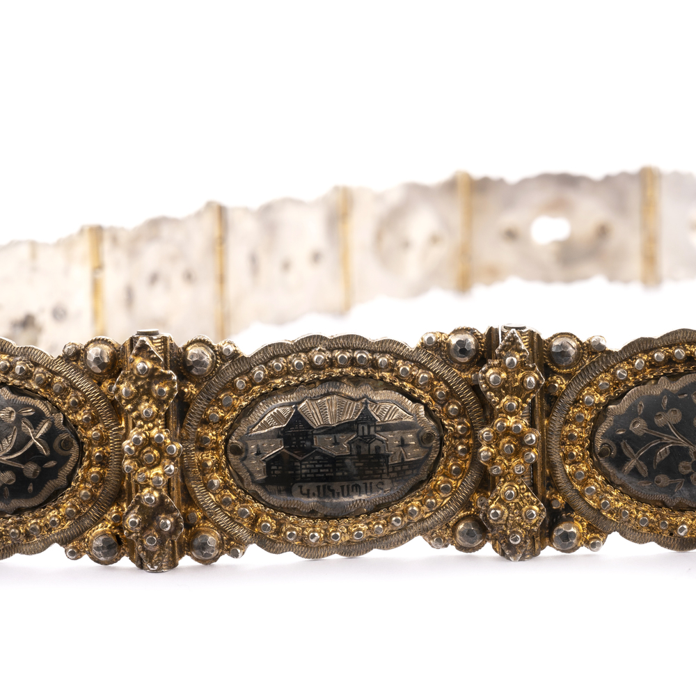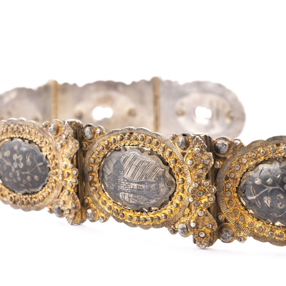 Corpo rappresentato da quindici placche ovali con decorazioni a niello, racchiuse da cornici perlinate dorate