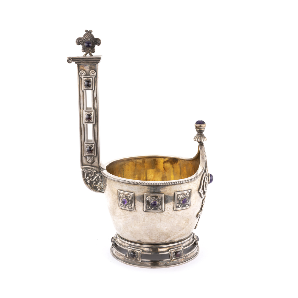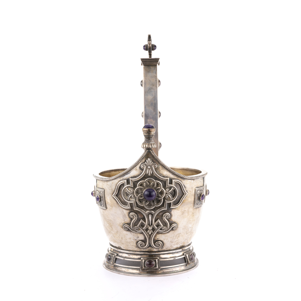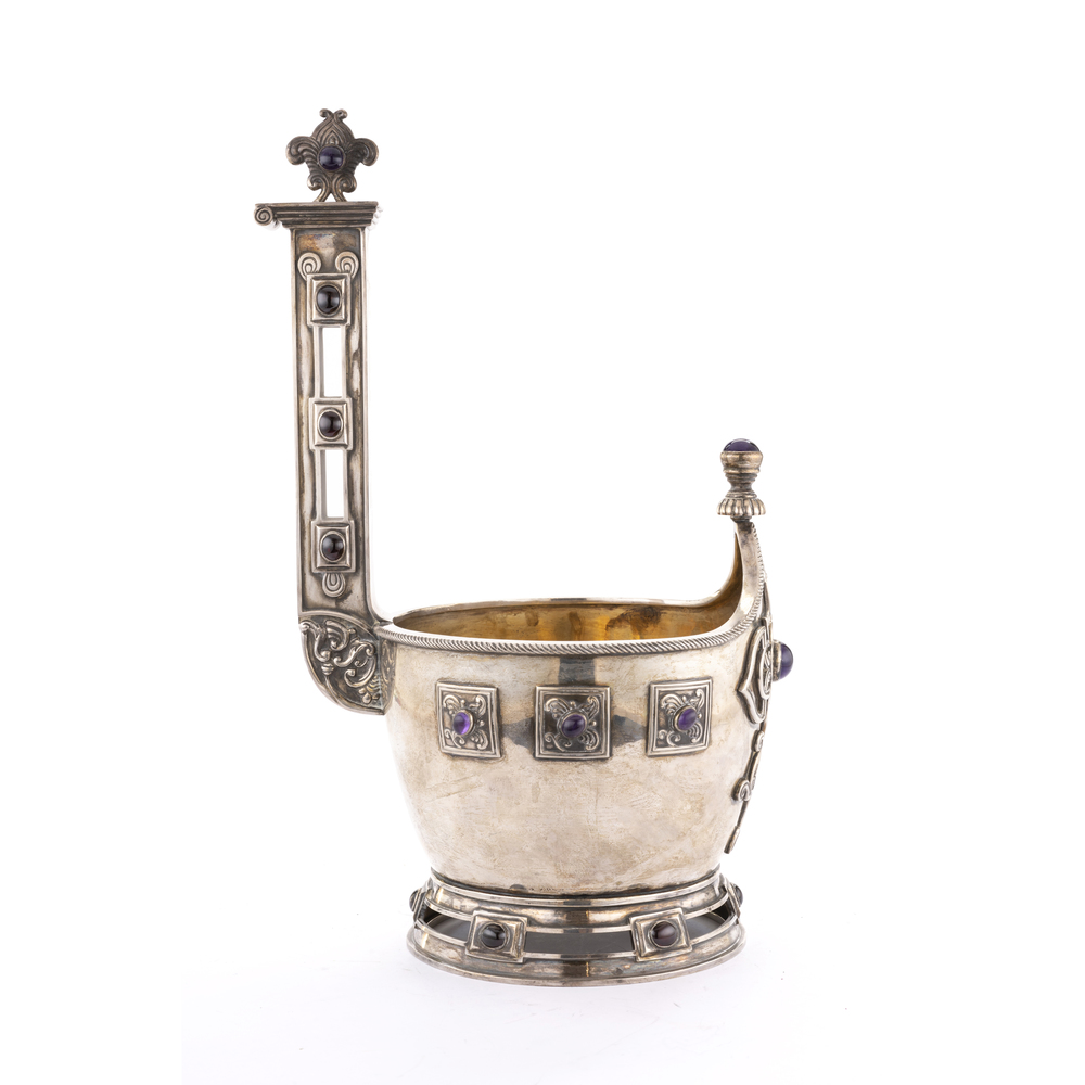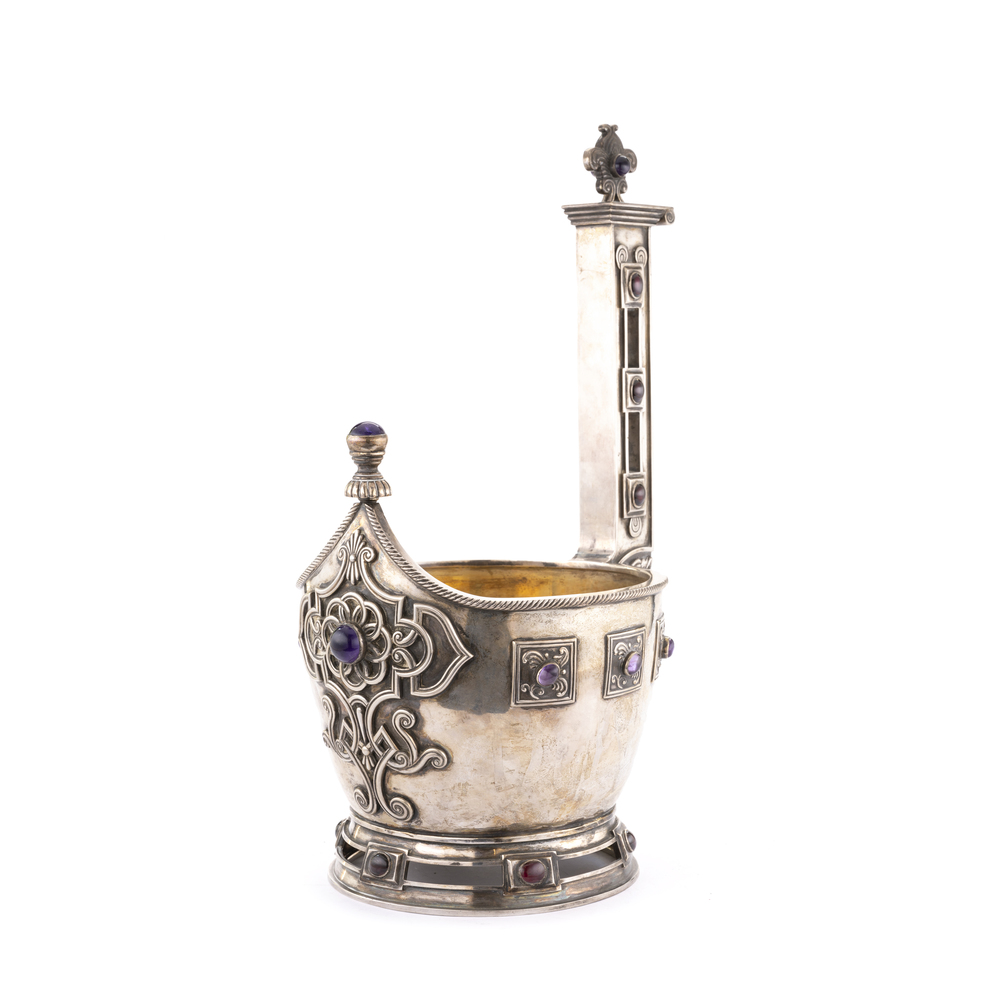 Corpo a forma tondeggiante con parti traforate e pietre dure incastonate