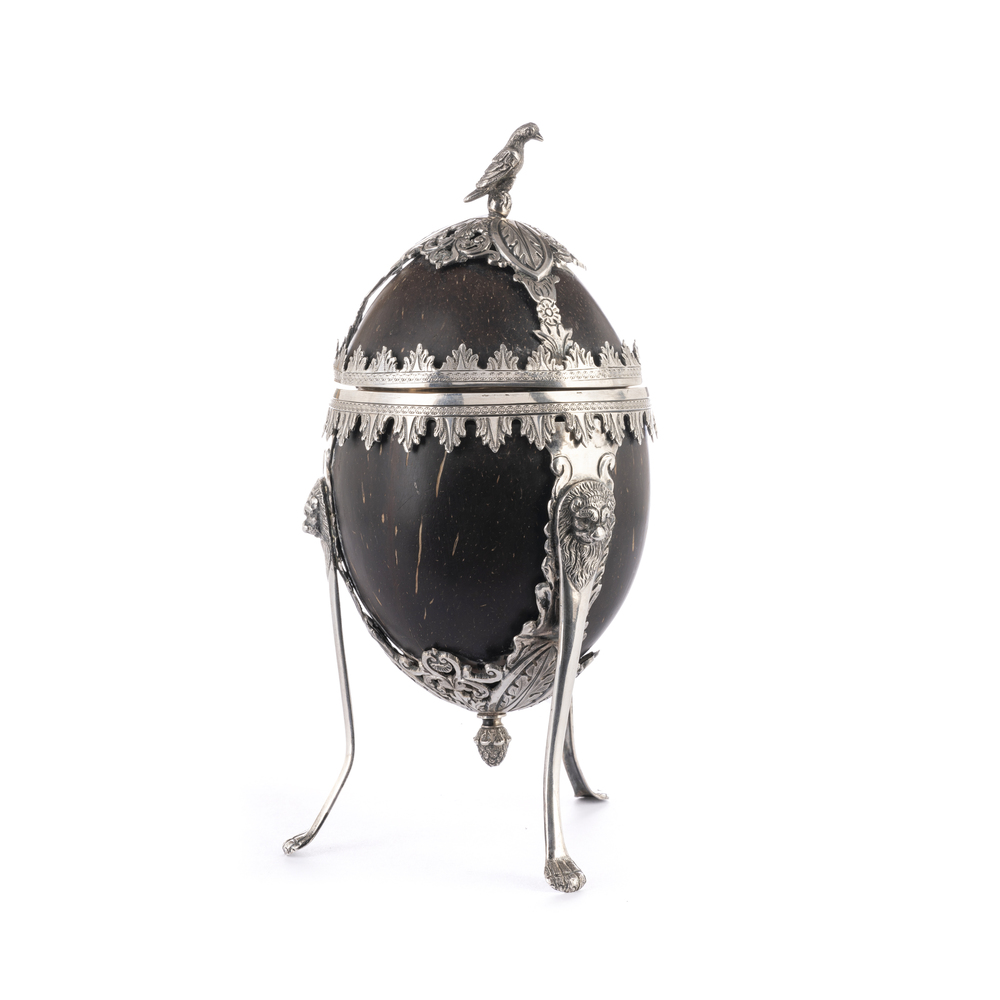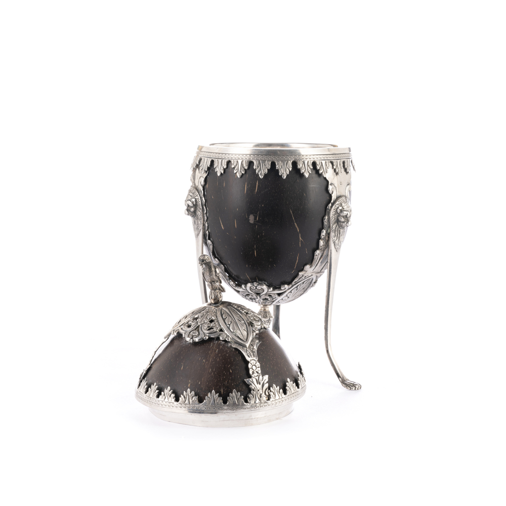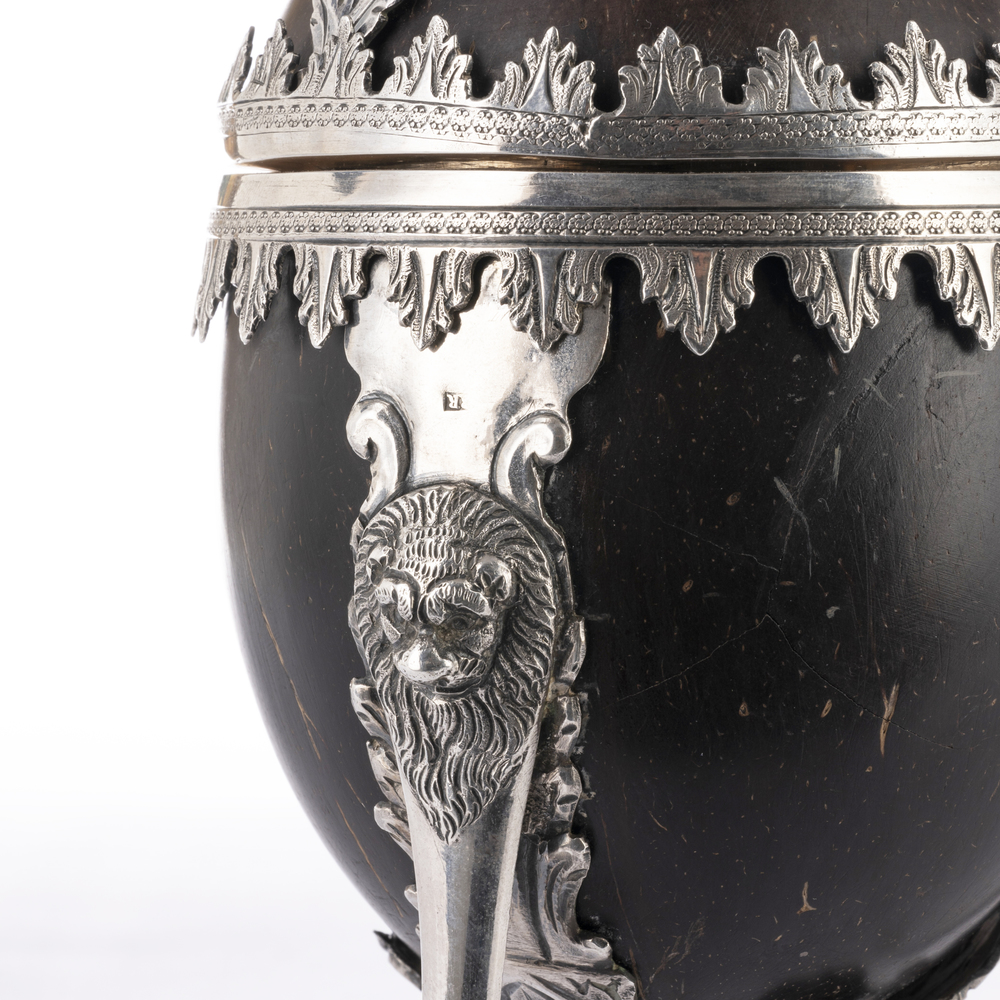Porta dolci in cocco con applicazioni in argento, su tre montanti a teste leonine terminanti a zampa ferina
