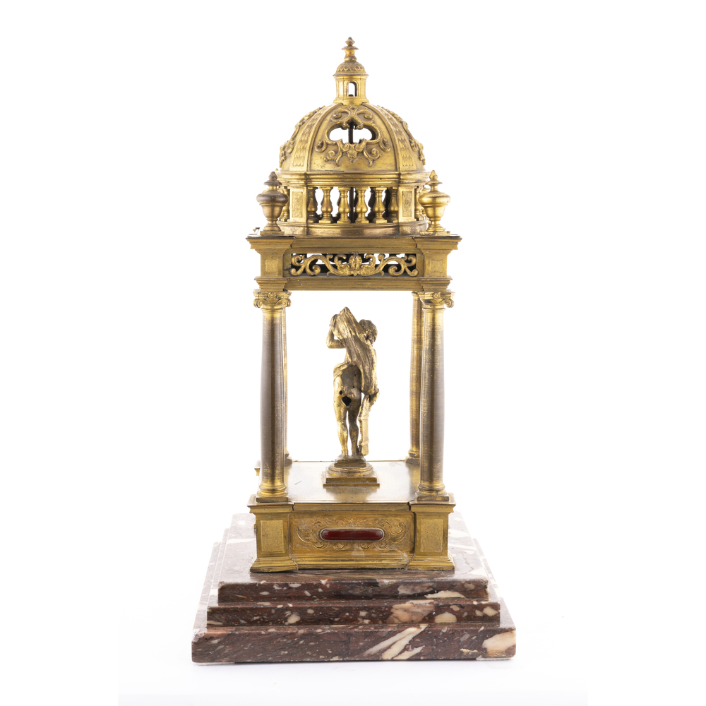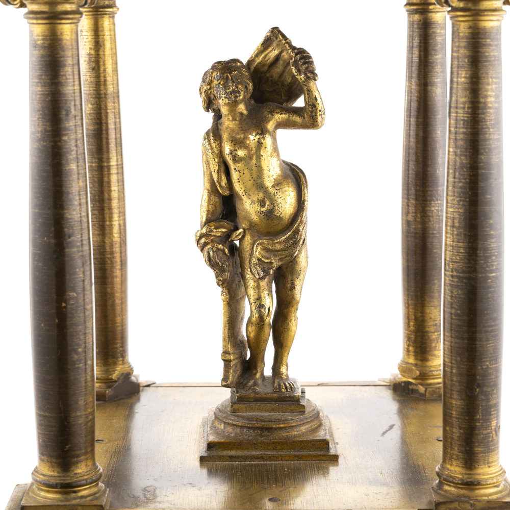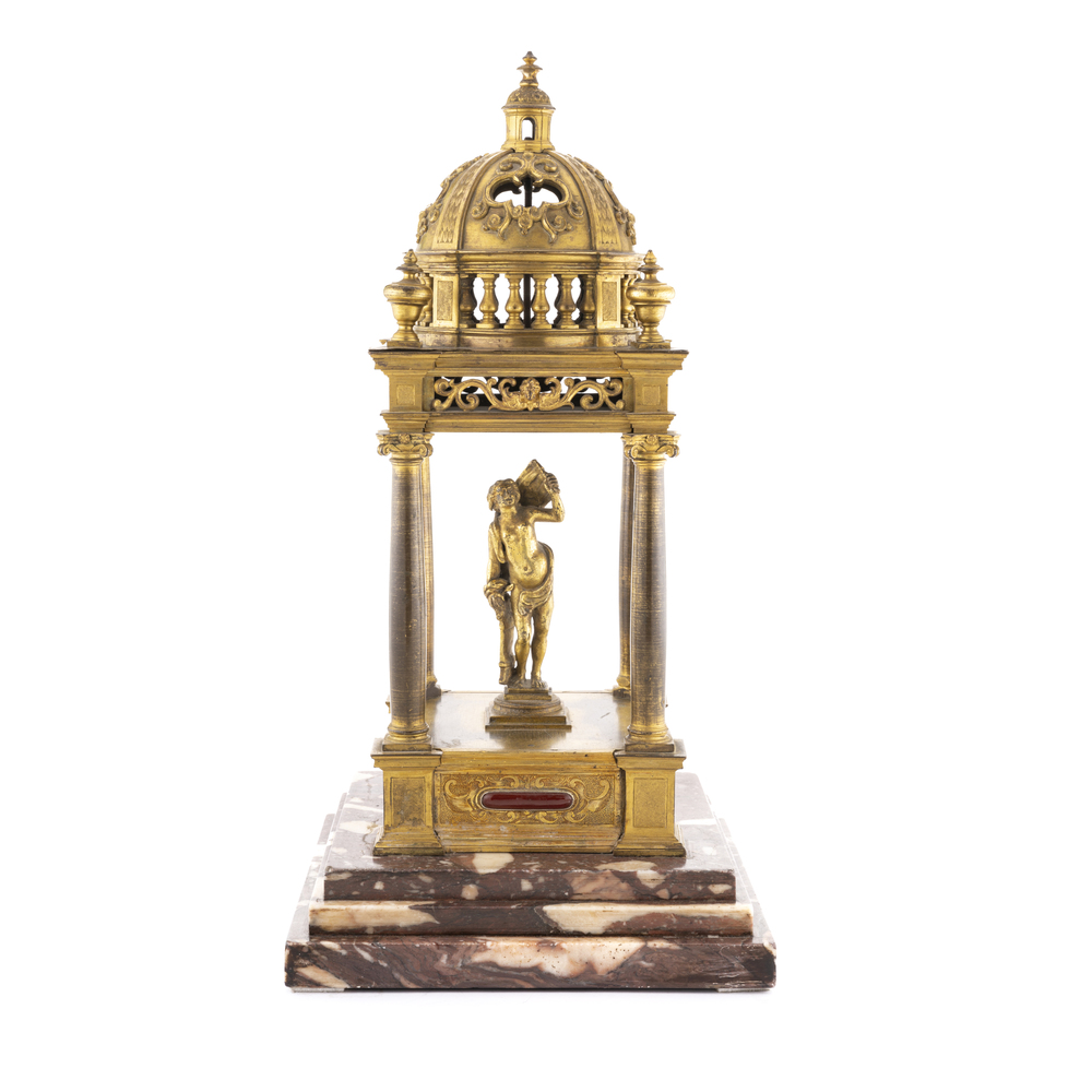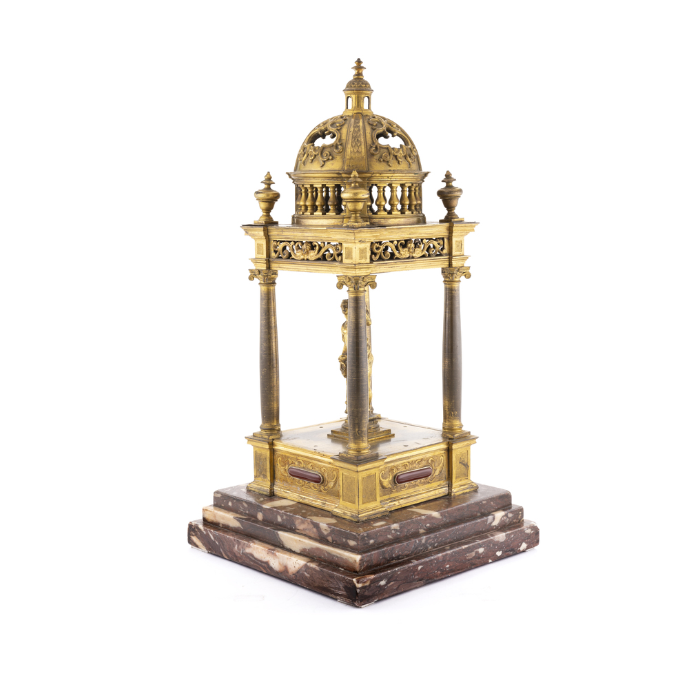 A model of a temple in gilded bronze , with four columns and a mythological figure in the center