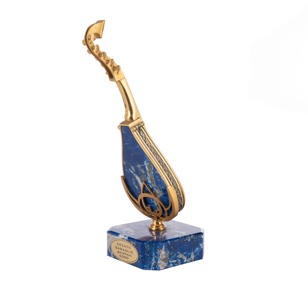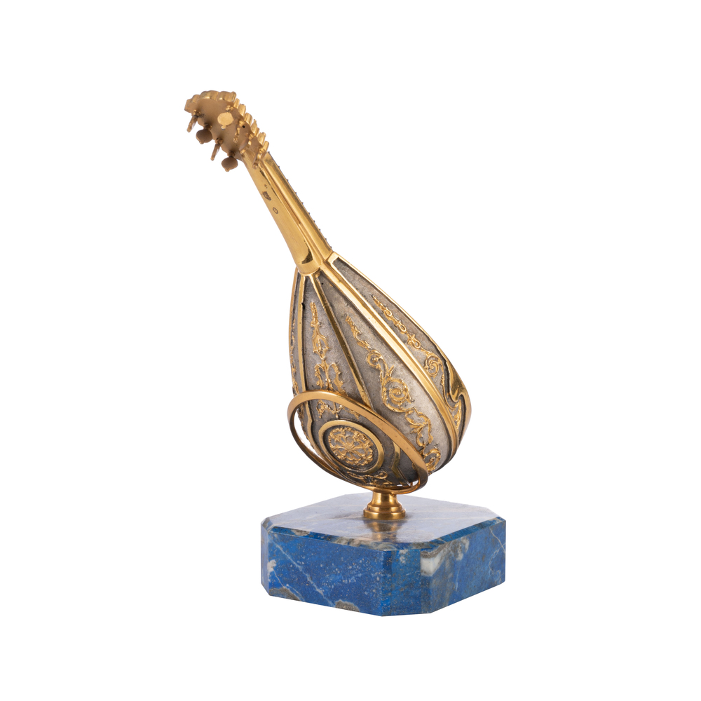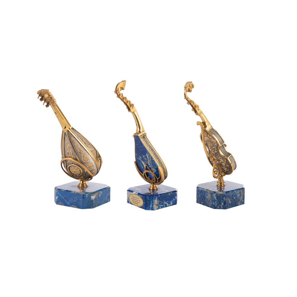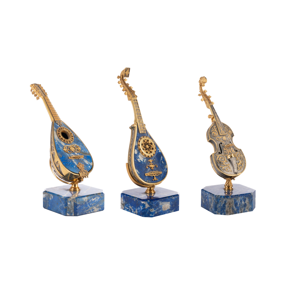 Tre modelli di piccoli strumenti musicali in pietra dura e argento dorato