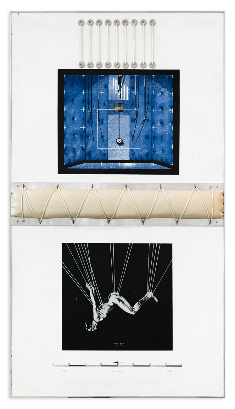 Multiplo assemblage, masonite, tessuto, corda, ferro e stampa