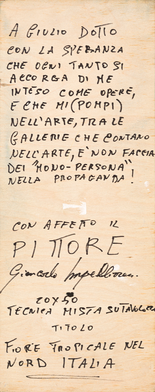 Firma, titolo, tecnica, misure e dedica ad personas al retro