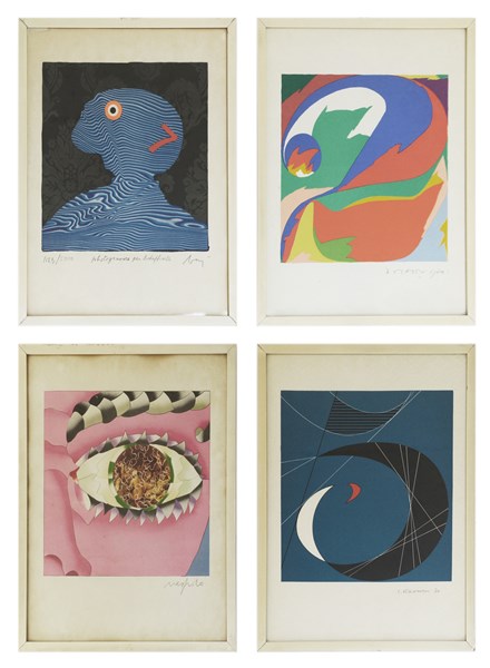 Lotto composto da quattro riproduzioni fotolitografiche (cm 30x23,5) di soggetti diversi dalle opere di Nespolo, Baj, Veronesi, Dorazio