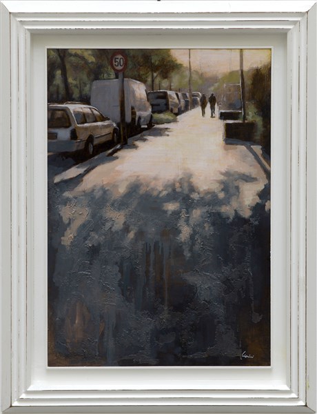 Claudio Cionini "Lungo il marciapiede" 2010 olio su tavola cm 70x50 firmato in b