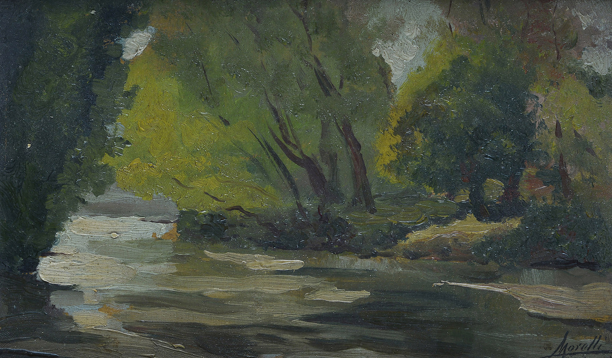 Victor Morelli (1860-1936) Scorcio di paesaggio con fiume Olio su tavola, cm 14x23,5 Firma in basso a destra.