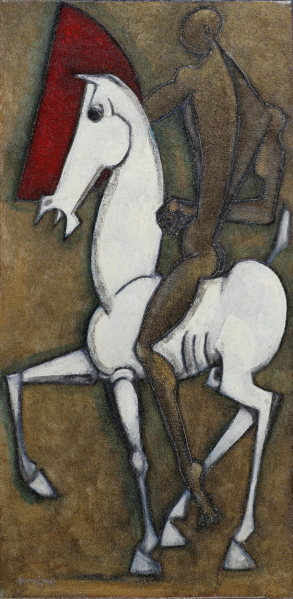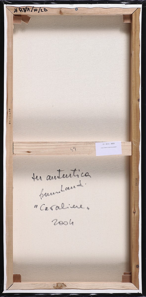 LANDI BRUNO (n. 1941) Cavaliere. 2004. Olio su tela . Cm 40,00 x 80,00. Firma in basso a sinistra. Al retro firma per autentica, titolo e data. Opera archiviata presso l'Archivio fotografico generale delle opere di Landi Bruno come da documentazione fotografica allegata riportante il relativo numero d'archivio.