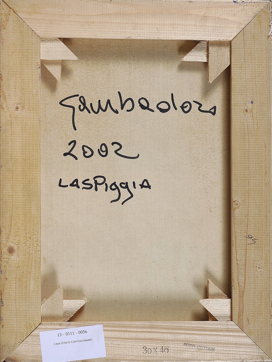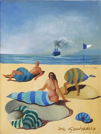 GAMBADORO ANTONINO (n. 1965) La spiaggia. 2002. Olio su tela. Cm 30,00 x 40,00 x 2,00. Firma e data in basso a destra. Al retro firma, titolo e data.