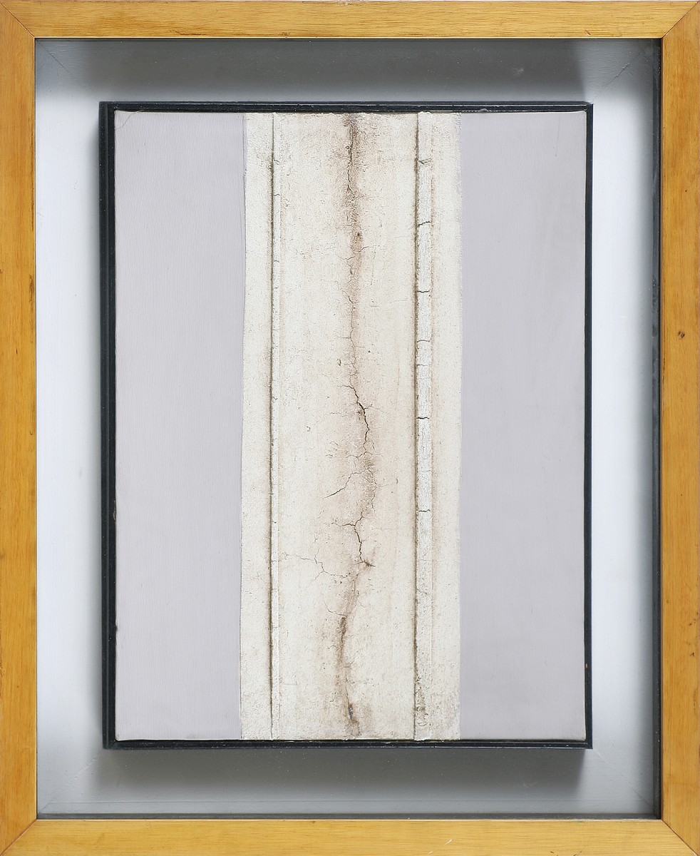 SASSU ANTONIO (n. 1950) La crepa. 1982. Tecnica mista su tela. Cm 30,00 x 40,00. Al retro titolo firma e anno. Cornice presente