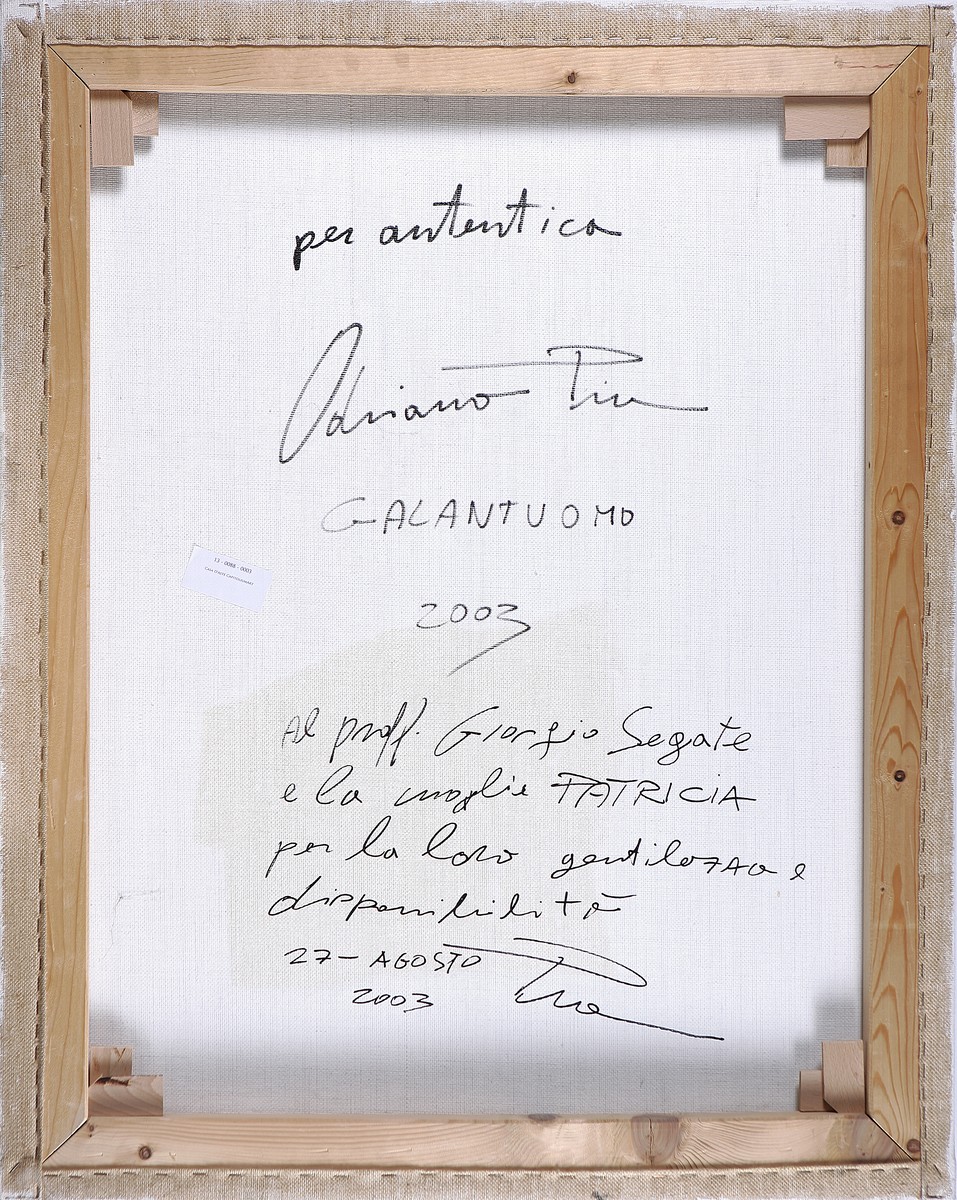 PINI ADRIANO Galantuomo. 2003. Tecnica mista su tela. Cm 80,00 x 100,00. Firma in basso a sinistra. Al retro firma titolo anno e dedica.