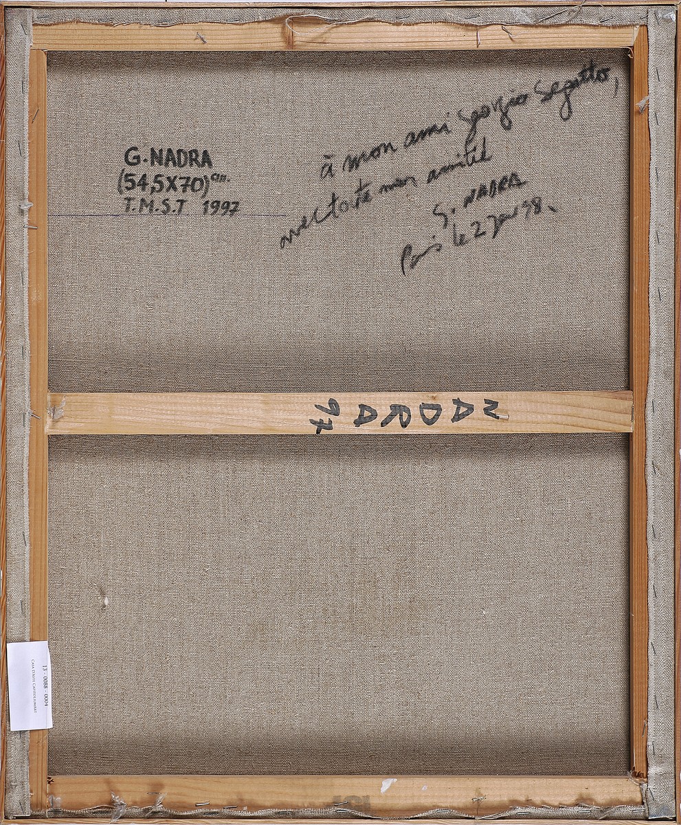 NADRA GEORGES (n. 1959) Senza titolo. 1997. Tecnica mista su tela. Cm 54,00 x 65,00. Al retro firma anno e dedica.