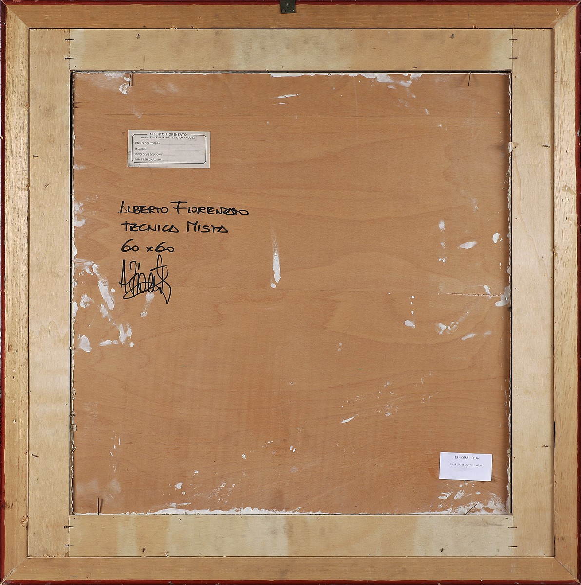 FIORENZATO ALBERTO (n. 1953) Senza titolo. Tecnica mista su tavola. Cm 60,00 x 60,00. Firma al retro. Cornice presente