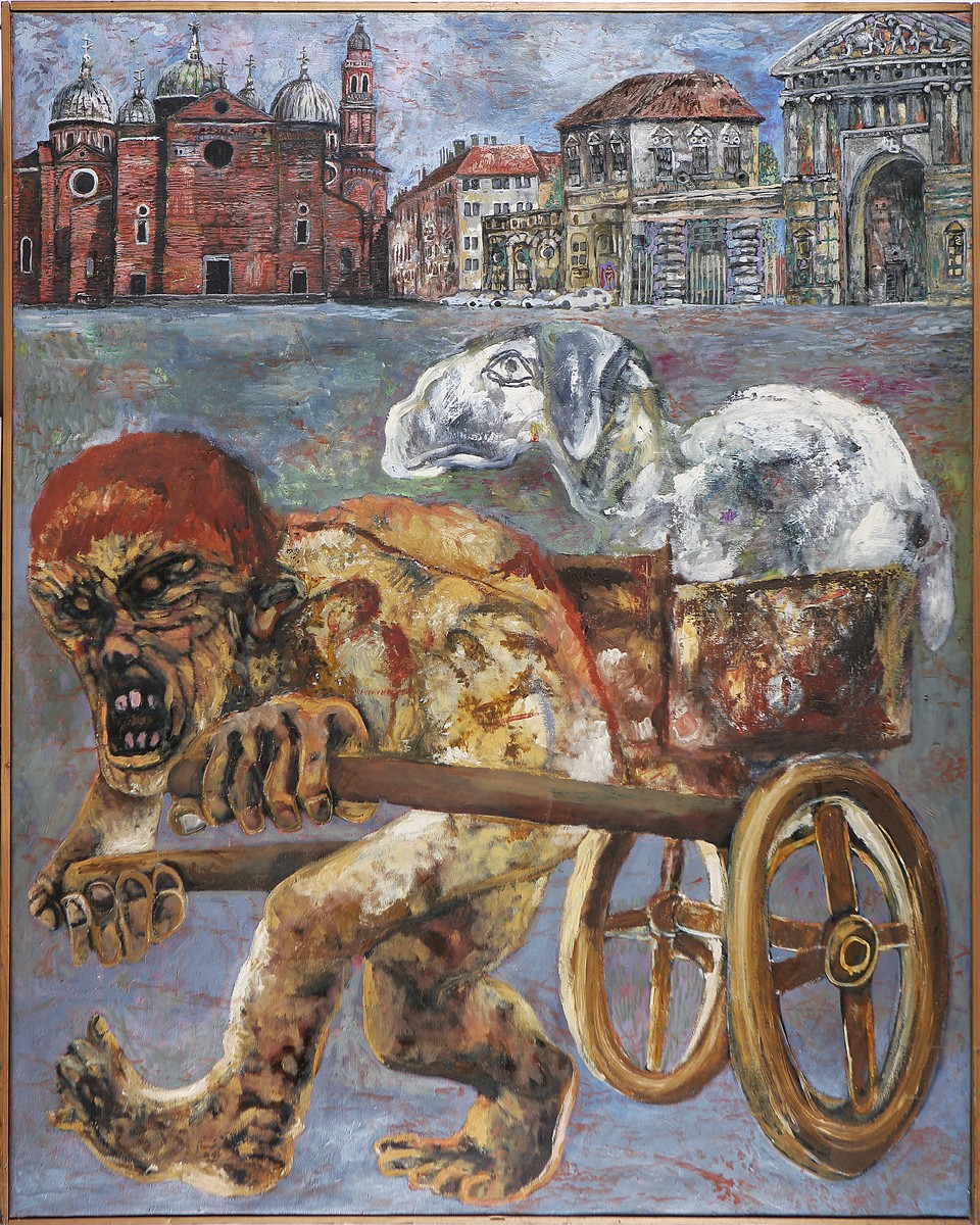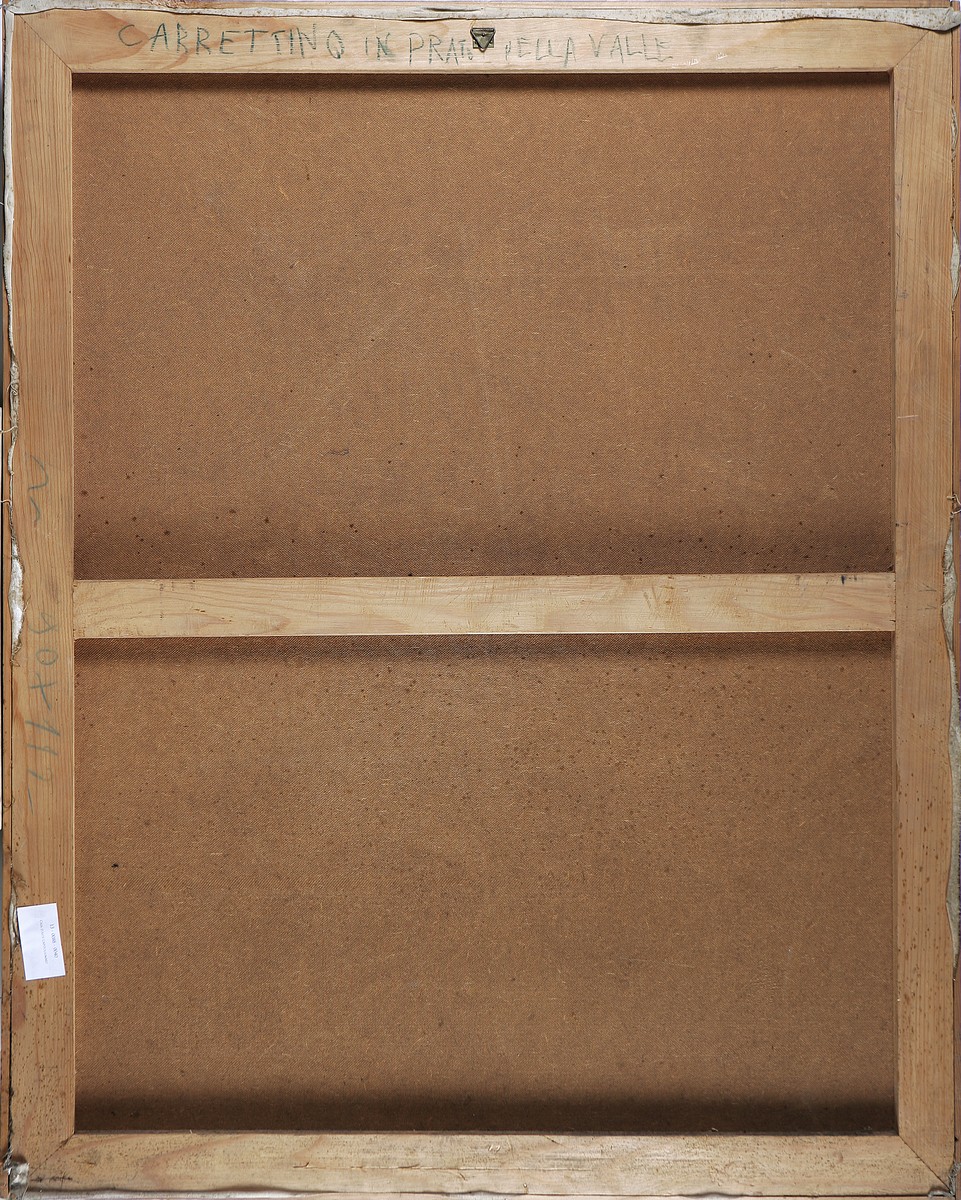 BUSSOTTI RENZO (n. 1925) Carrettino in Prato Della Valle. Tecnica mista su tavola. Cm 90,00 x 112,00. Titolo al retro. Cornice presente