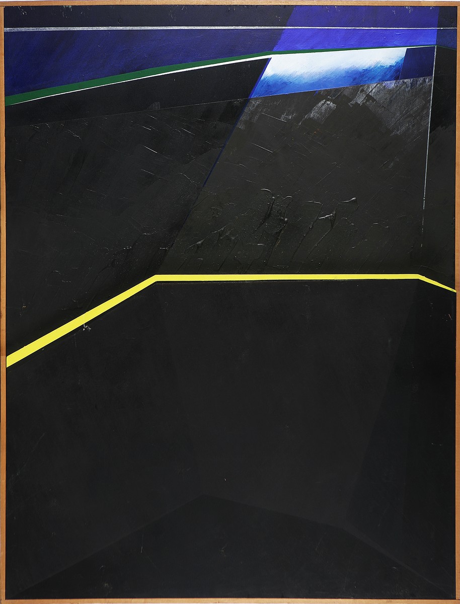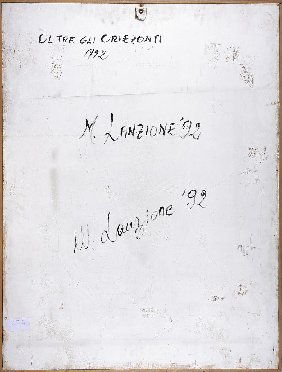 LANZIONE MARIO (n. 1951) Oltre gli orizzonti. 1992. Acrilico su tavola. Cm 85,00 x 110,00. Al retro firma titolo e anno.