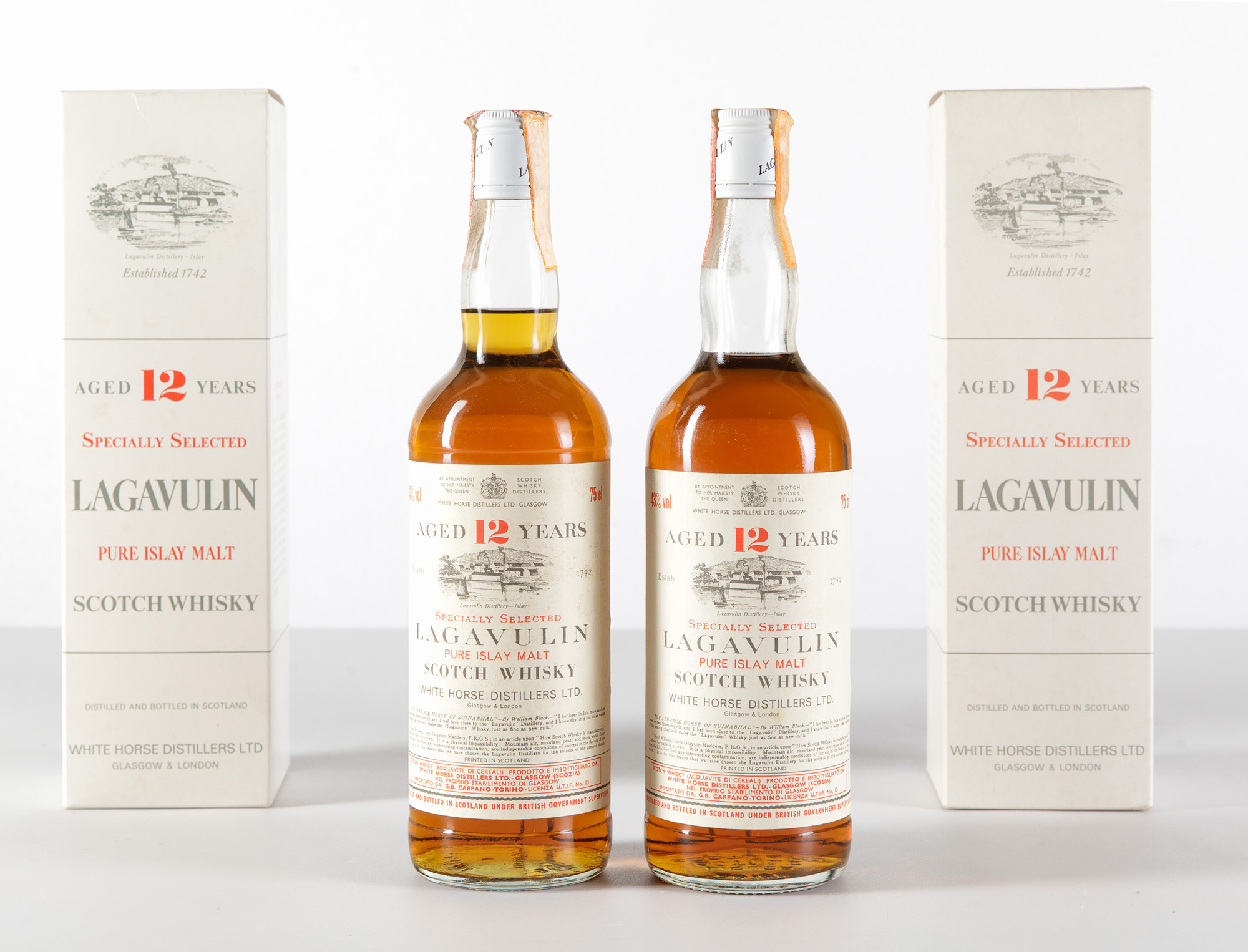 Lagavulin, White Horse Distillers, Pure Islay Malt Scotch Whisky 12 years old, (2 Bts) 43% 1 Bt TS 1 Bt WN OC