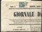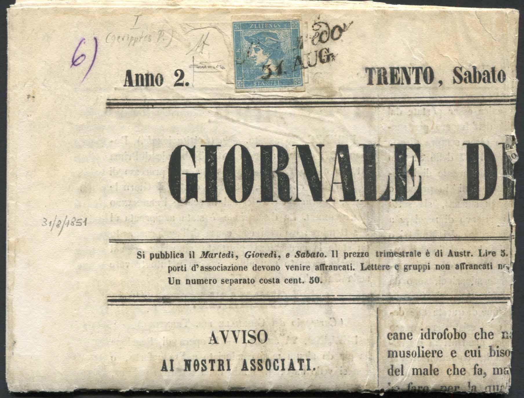 Lombardo Veneto. Francobollo per giornali da 3 cent., Azzurro grigio, carta a coste verticali (S.6) su “Giornale del Trentino” del 30 agosto 1851, annullato col bollo in corsivo di Roveredo. Cert. F. Sottoriva.