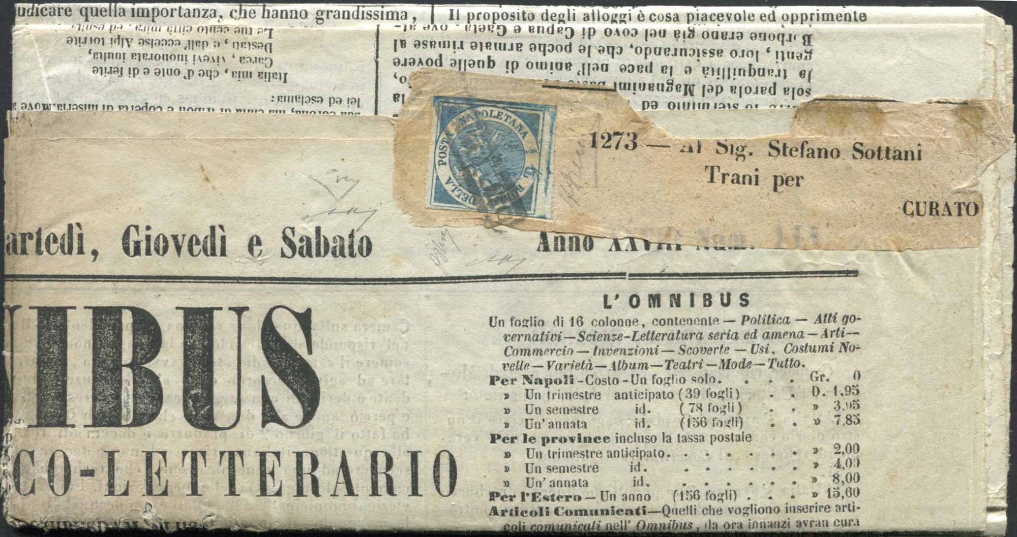Napoli Dittatura, “Trinacria” 1/2 Tornese azzurro, pos. 32 del volume di De Angelis Pecchi, su fascetta per Trani del 1 Dicembre 1860. Ottimi margini , E. Diena, G. Bolaffi.