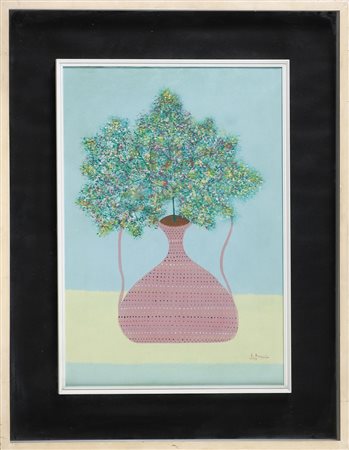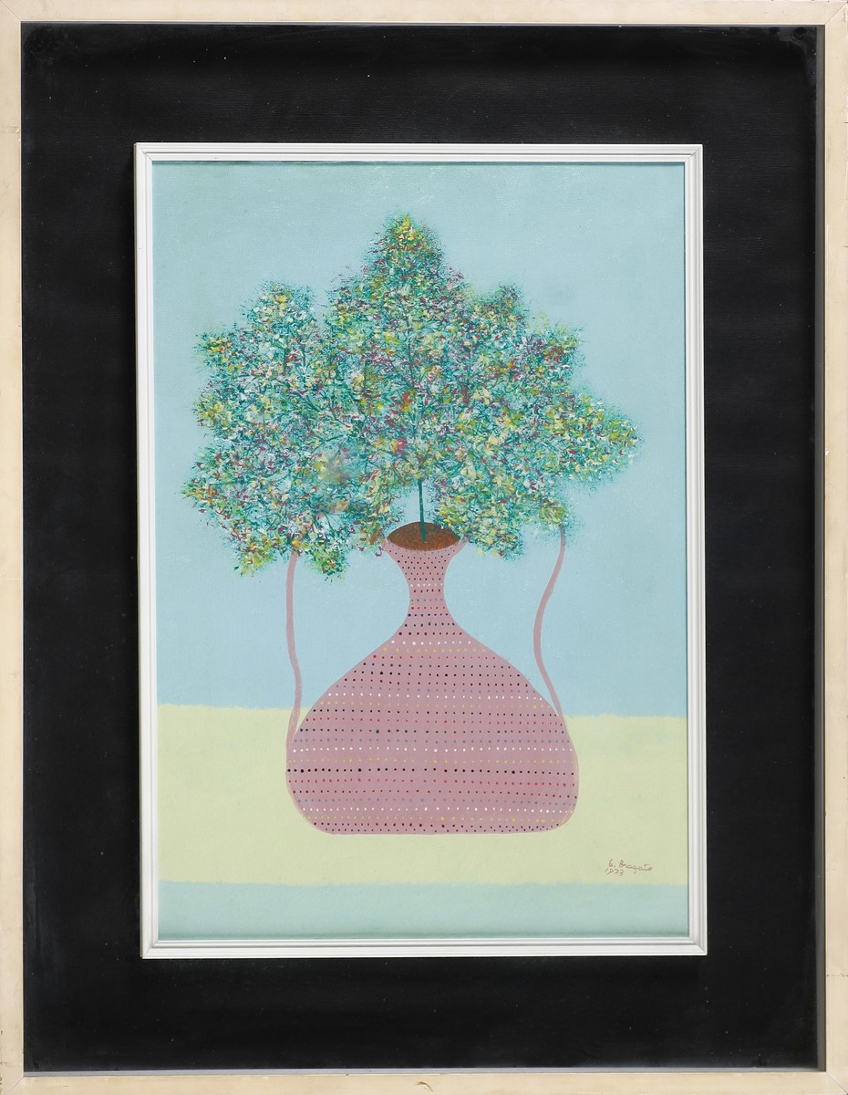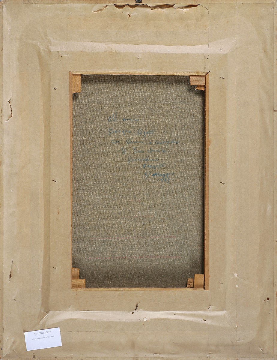 BRAGATO GIOACCHINO (n. 1940) Senza titolo. 1973. Tecnica mista su tela. Cm 35,00 x 50,00. Firma e anno in basso a destra. Dedica al retro. . Cornice presente