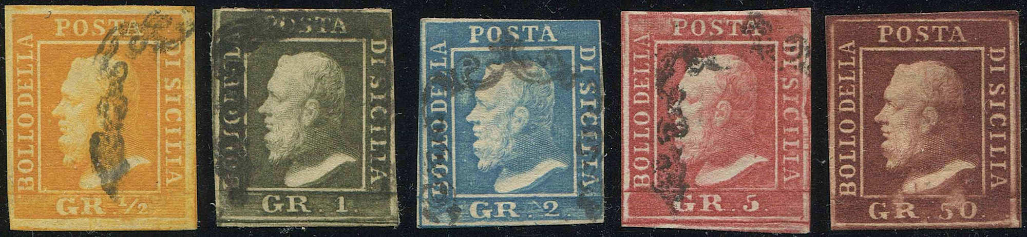 1859, Sicilia. Gruppo di esemplari in ottimo stato., 1/2 gr.; 1 gr.; 2 gr. usati; 50 gr. nuovo (s. 1a,5b,6h,9,14a) Molto freschi, Firmati.
