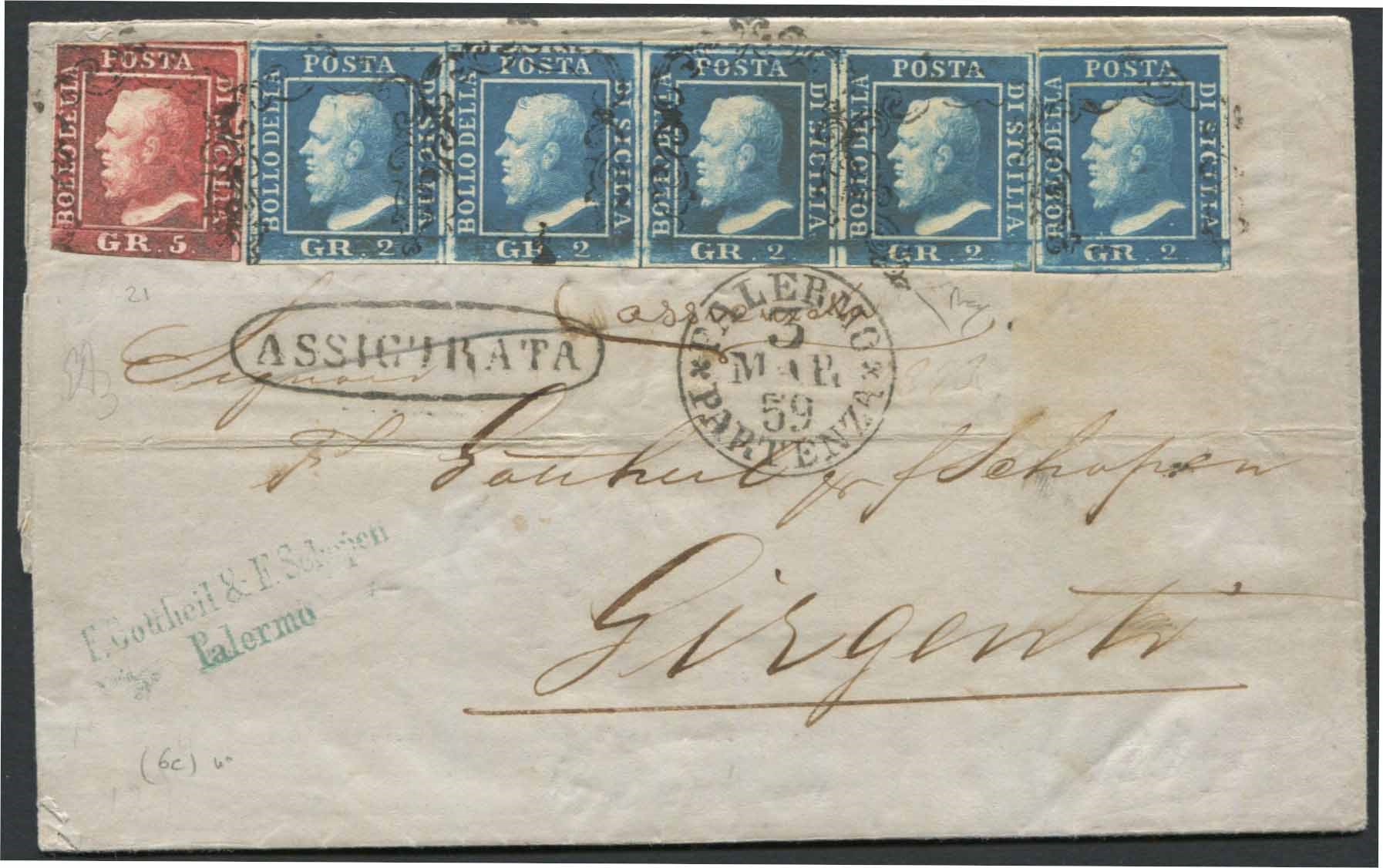 1859, Sicilia, assicurata da Palermo per Girgenti del 3 marzo 1859., Affrancata con 5 grana carminio (S. 9a, pos. 21) più striscia di quattro del 2 grana cobalto scuro I tav., e un esemplare singolo (S. 6c pos. 87, R88, 89, 90 + 6c pos. 74). Il 5 grana “toccato” in basso. Spettacolare e rara affrancatura. E. Diena, ex Collezione “Alphonse” del 20 novembre 1986, lotto 160.