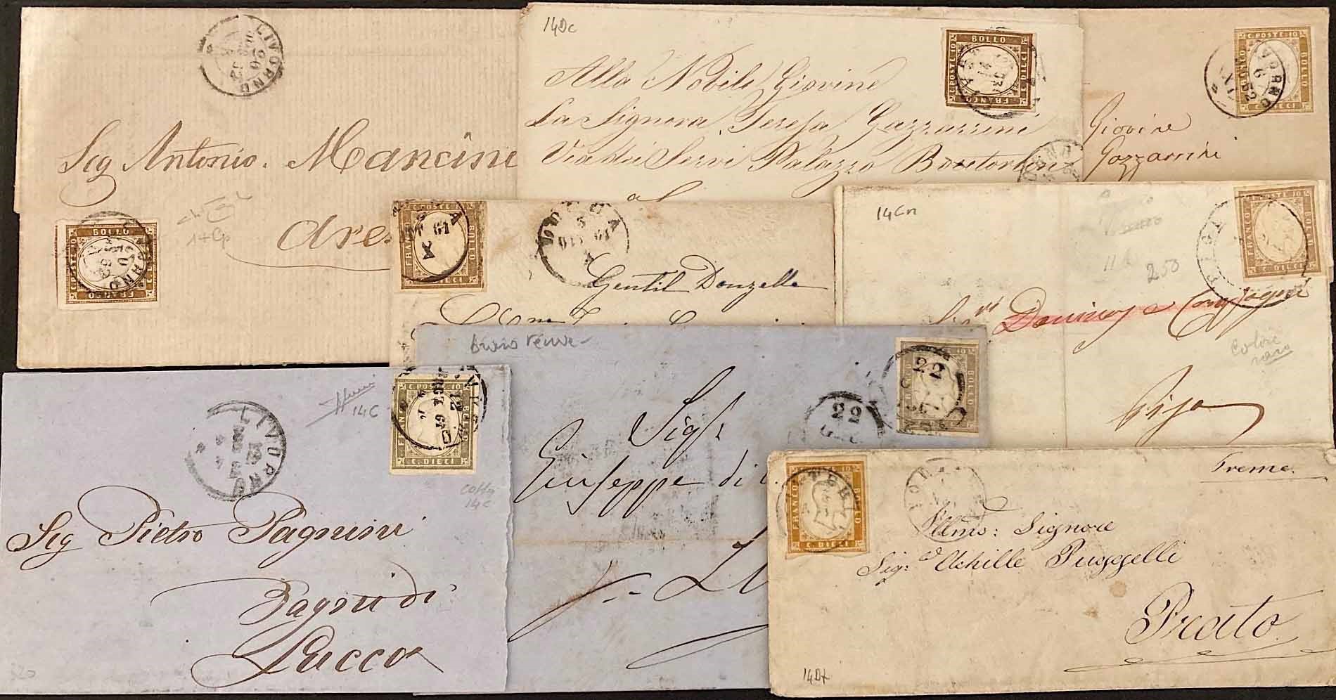 1861/62, Sardegna. Otto lettere., Affrancate ognuna con 10 cent. della IV emissione. Anni 1861/1862. Varie tinte (s. 14C e 14D) tutte diverse. Buona qualità, tutti annulli di Toscana, qualcuna firmata.