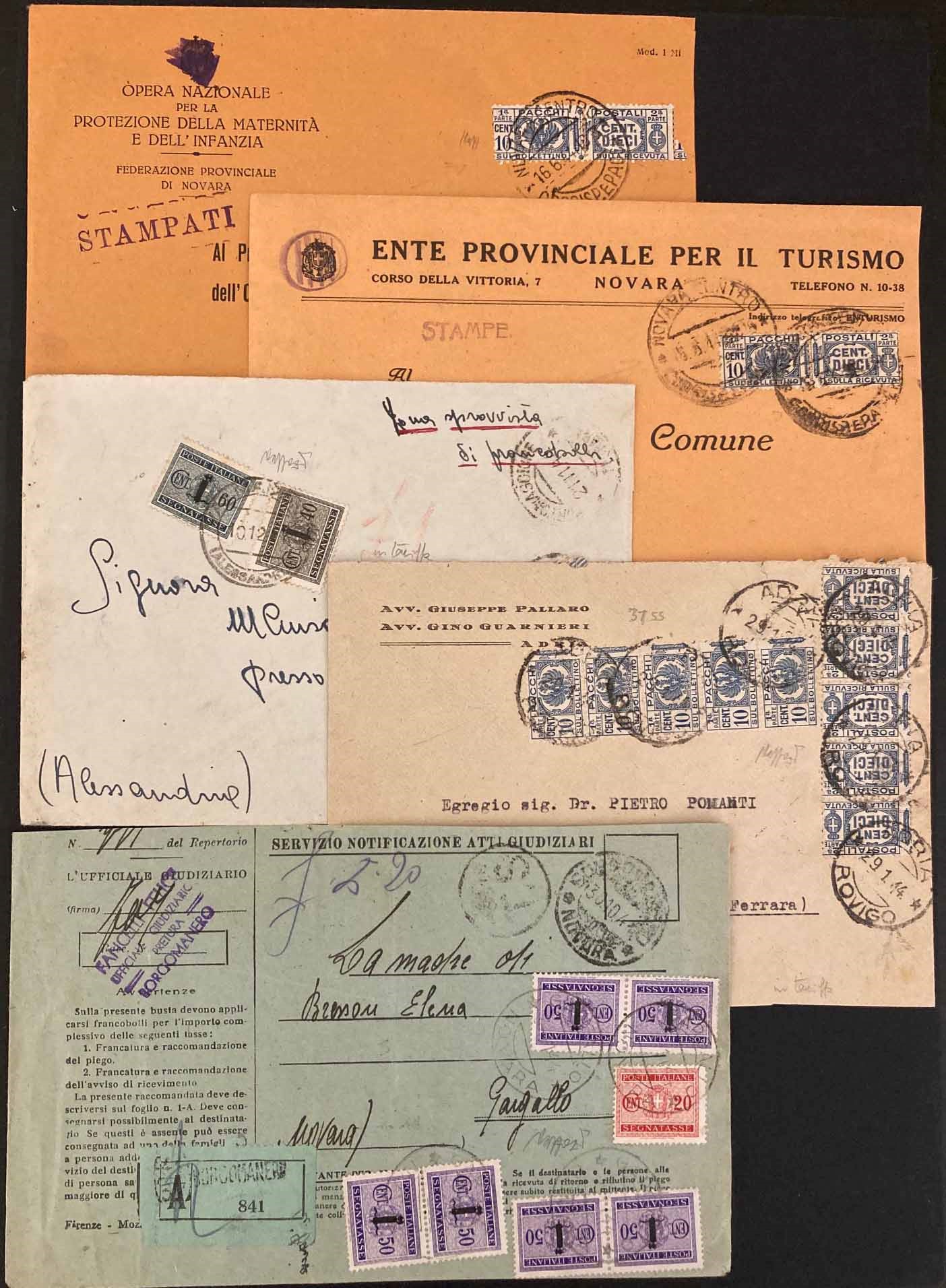 1944, Segnatasse, affrancature d'emergenza, cinque buste,, Due affrancate con segnatasse 40 e 60 cent. sopr. fascetto (S. 65-67) e atto giudiziario con 3 coppie 50c. (S.66)+20c.(S.36) con cert. Caffaz. Inoltre tre buste affr. con 10c. pacchi postali, in affr. d’emergenza, due isolati e una con striscia vert. separata di cinque es. con Cert, Caffaz. Insieme. Interessante per specialista.