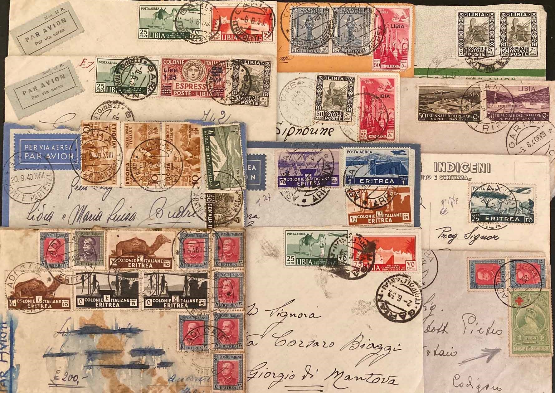 1935/50. Colonie Italiane, 6 cartoline e 15 buste, Provenienti dalle colonie per l’Italia. Alcuni bolli di origine interessanti, da esaminare, qualità mista.