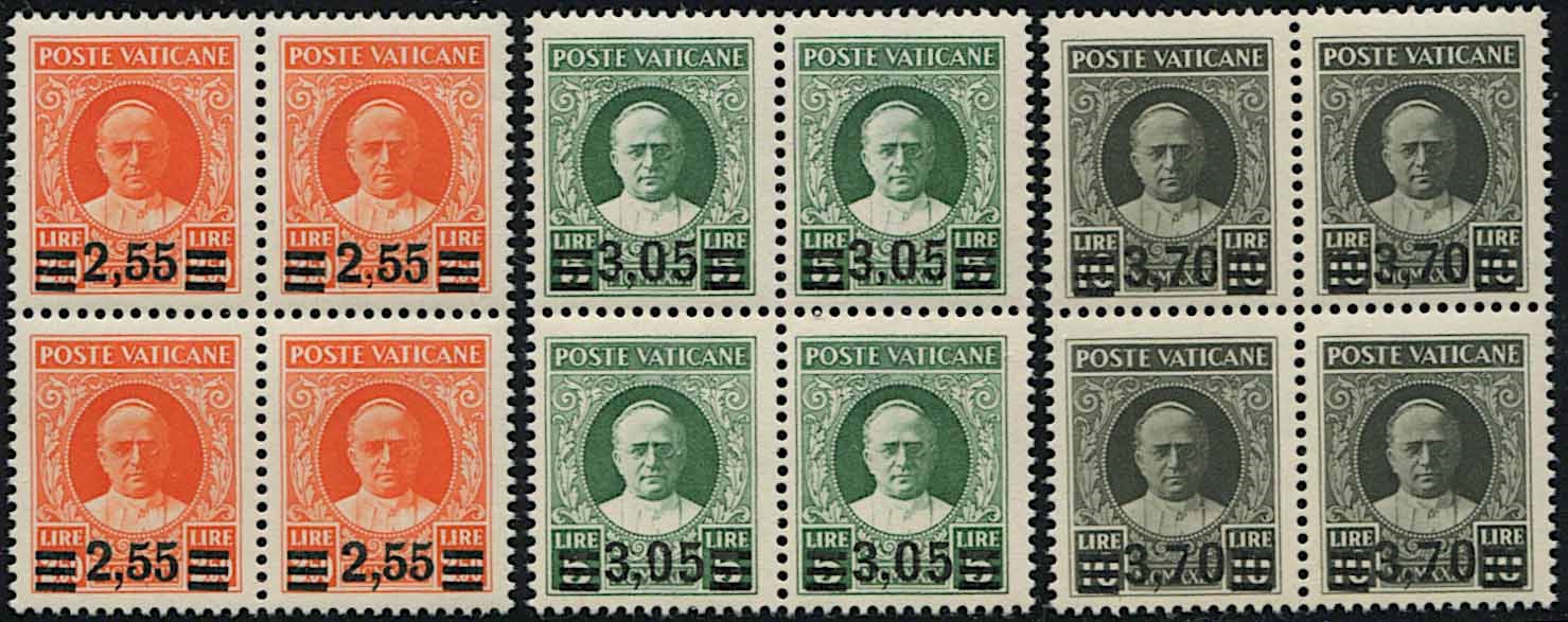 1924, Città del Vaticano, “Provvisoria”, Serie di sei valori in blocchi di quattro g.i. (S. A35/A40). Un valore da 2,05 con la varietà “senza virgola tra le cifre” (S.A37g). Bellissima e non comune, Cert. D. Carraro.