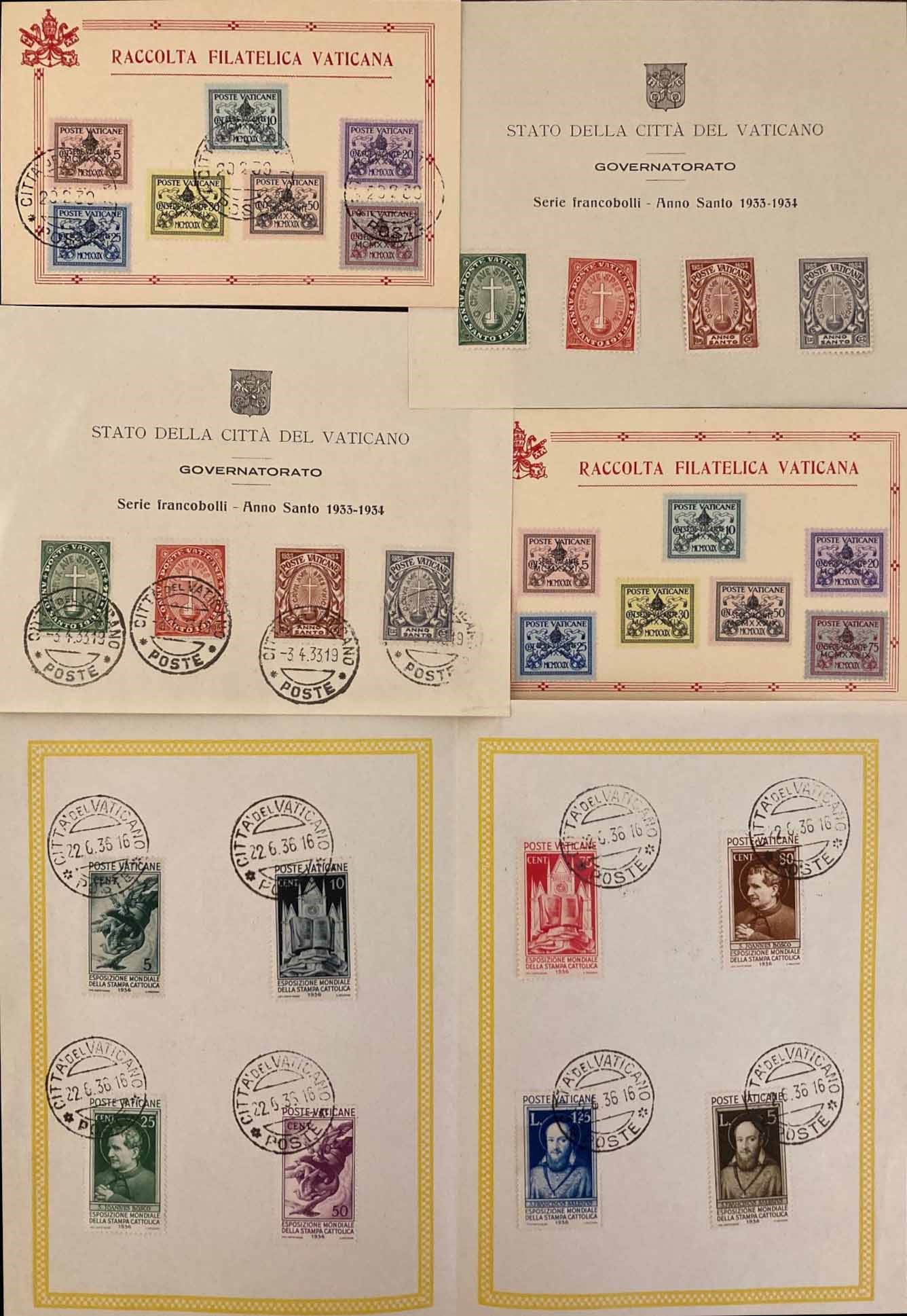 1929 Vaticano, fogli intestati “Stato della Città del Vaticano/Ufficio filatelico”, Con incollate quattro serie “Conciliazione” (S.2) nuove + 2 con bollo 1° giorno; due serie “giardini e medaglioni” (S.6) con bollo 1° giorno;+ altri foglietti “raccolta filatelica vaticana” con 4 serie “Sede vacante” (S. 14) nuove (incollate) e 4 usate. Inoltre serie S.11 usata e un paio “Anno santo” (S.3) nuova (incollata) e usata il I giorno. Insieme non comune.