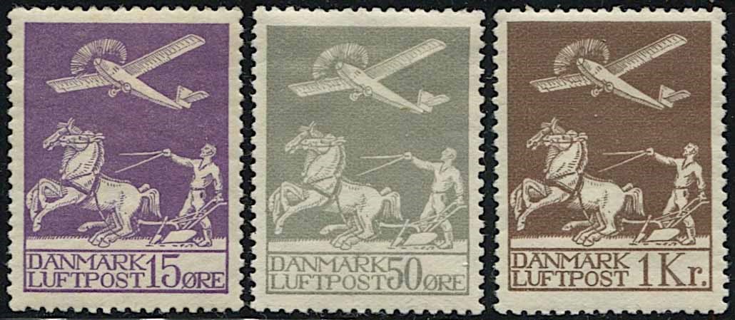 1925/1929, Danimarca, P.A., aereo in volo,, Serie di cinque valori (Un. A1/A5). Lieve t.l.