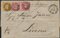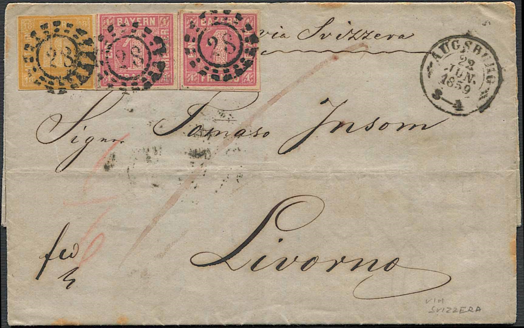 1859, Baviera, lettera da Augusta per Livorno del 22 giugno 1859,, Affrancata con due es. dell’1K. rosa e uno da 18K ocra (YV. 4,8) con fili di seta, annullati con bollo a ruota dentata n°”28” di Augsburg. Transitata “Via di Svizzera” via Chur (23 giugno), Tassata in rosso al verso “10” per i diritti postali elvetici e 6 soldi sul frontespizio per i diritti austriaci. Fr. da 18K leggermente sfiorato in basso. Non comune.