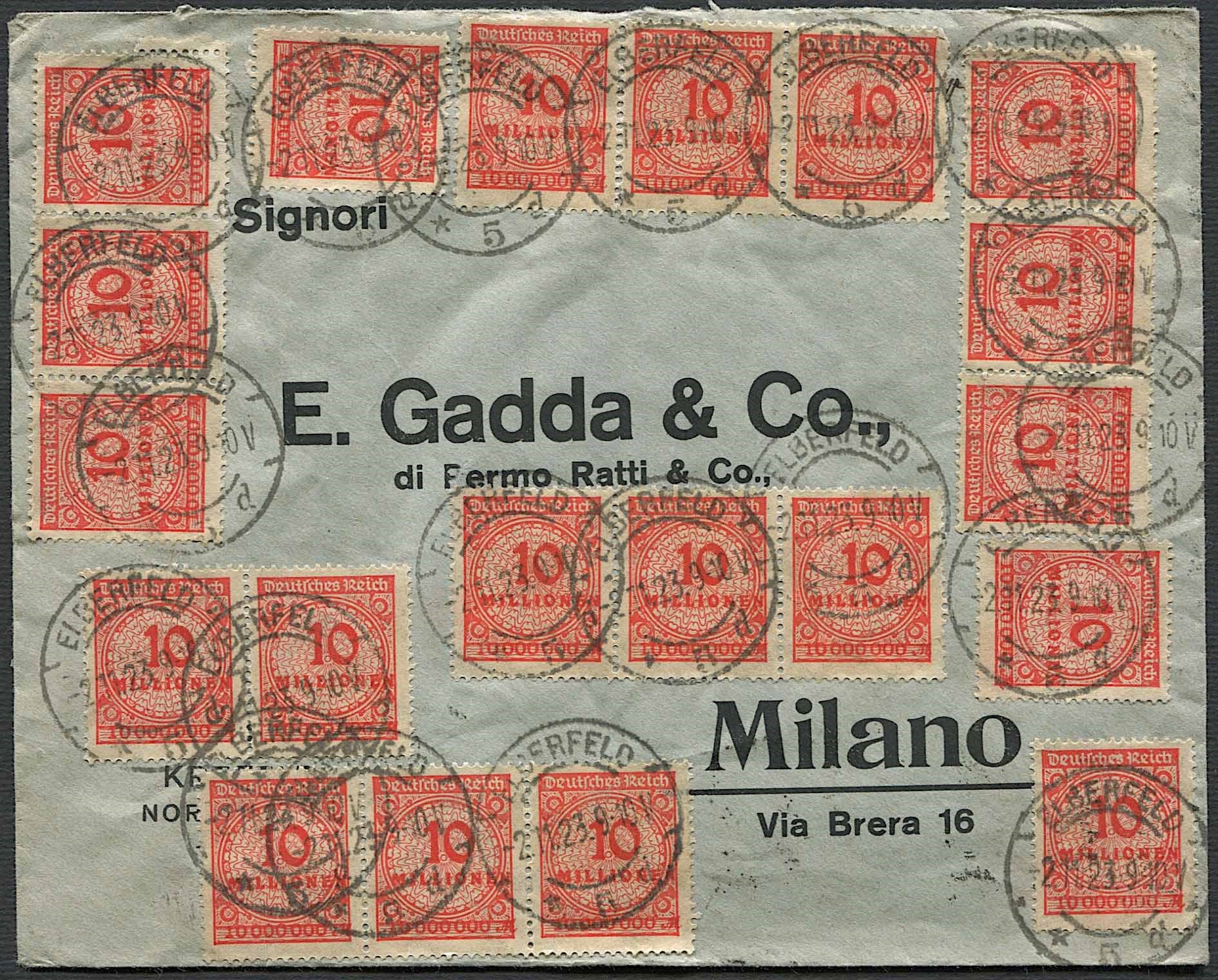 1923, Germania, lettera da Elberfeld per Milano del 2 novembre 1923, Affrancata sul fronte con 20 esemplari e al verso con 10 esemplari del valore da 10 milioni di marchi, in tutto con 300 milioni di marchi, (YV.299). Spettacolare affrancatura in periodo dell’inflazione.