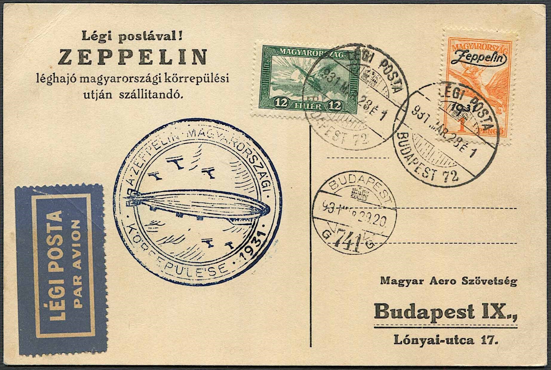 1931, Ungheria, cartolina affrancata con francobollo soprastampato “ Zeppelin” (Yv. PA 24), Col bollo speciale del volo del 28 marzo 1931 (Sieger 102). Molto bella.