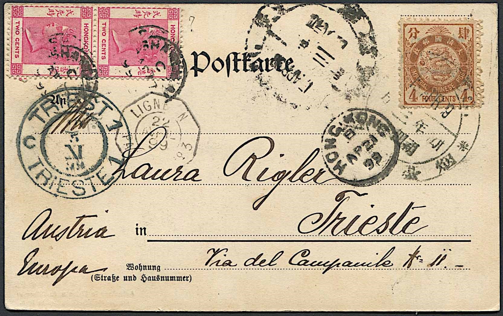 1899, China, (Apr.17) a mixed franking picture postcard from Chefoo to Triest, Franked with China 4c. brown, tied by large Chefoo Chinese 2-ring bilingual c.d.s.; Shanghai bilingual c.d.s. on transit on 2c. H.K. QV carmine in pair. Arrived on Apr, 21 in H.K., the postcard was embarked on a French packet “Ligne N-Paq. F.R. n°3”. Alongside a d.c. “Triest 1” on arrival. Very fine.