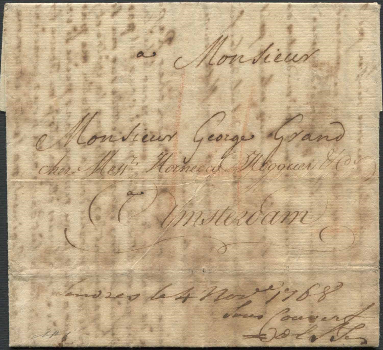 1768, Canada, lettera da Montreal per Amsterdam dell'8 agosto 1768, viaggiata con nave da New York per Falmouth/Londra e qui giunta il 4 novembre dopo 88 giorni di viaggio, attraversando i Grandi Laghi e l’Oceano. Al verso è indicata la tariffa espressa in currency, pagata per il trasporto: 3,6 cy, poco più di 3 sterline. Sempre al verso, il manoscritto del forwarder “Londres le 4 nov.re 1768, Sous Couvert”. Straordinario documento, uno degli ultimi viaggi in questo periodo dal porto di New York, prima di utilizzare la rotta per l’Europa via Halifax. Infatti, il mittente specifica che “...depuis le mois d’Avril plus aisee mettonde d’envoyer des lettres dans ça pays est par les vaisseaux qui partant da Londre p. le Canada jusques 7.bre alors il faut ecrire par le paquet de New York.” Il mittente, nel testo, scrive al destinatario che la sua lettera del 30 marzo precedente, l’ha ricevuta a Fort William Henry, sul lago George. Fort Henry era un avanposto inglese situato al confine tra il territorio britannico di New York e i possedimenti francesi del Nord. In seguito al conflitto tra inglesi e francesi, dove ognuno dei due contendenti realizzava fortini per difendere il proprio territorio nel Nuovo Mondo, dal 1753 la guerra si protrasse per nove anni. Nell’agosto del 1757 Fort Henry fu assediato dalle truppe francesi appoggiate da centinaia di indiani appartenenti a circa 18 tribù diverse. Il forte, che poteva contenere circa 500 uomini, per circa una settimana fu circondato, bombardato, dato alle fiamme, e poi lasciato alla furia degli indiani, che non intendevano ritornare nei loro accampamenti a mani vuote. Fu un massacro. Furono trucidati oltre 150 soldati e civili disarmati, mentre i sopravvissuti si rifugiarono, terrorizzati, a Fort Edward, non lontano dal luogo dell’eccidio. Dal testo di questa lettera risulta che Fort Henry fu ricostruito, almeno parzialmente, per servire da Post Office e centro di comunicazione, uno dei primi nello Stato di New York, forse prima di Albany costituito nel 1775.