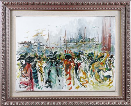 MERELLI ROBERTO (n. 1936) Carnevale, Piazza San Marco. 1997. Olio su tela. Cm 80,00 x 60,00. Firma in basso a sinistra. Al retro titolo firma e anno. Cornice presente