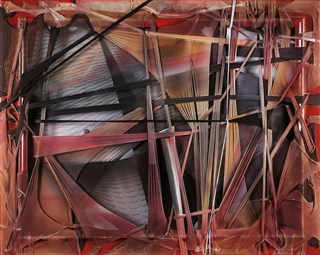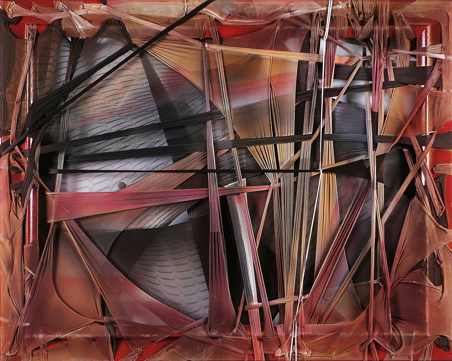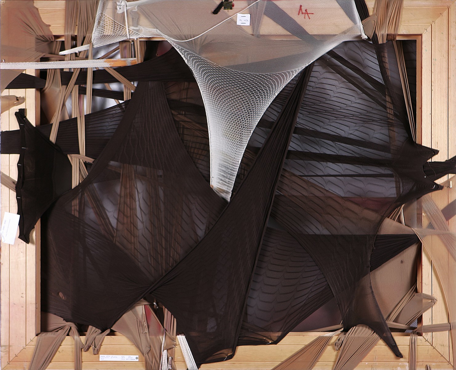 ALA (n. 1966) Cinque minuti. 2009. Tecnica mista . Cm 87,00 x 107,00. Materiale utilizzato: calze. Pubblicato in "Trame esistenziali" pagina 88. Autentica dell'archivio ALA.