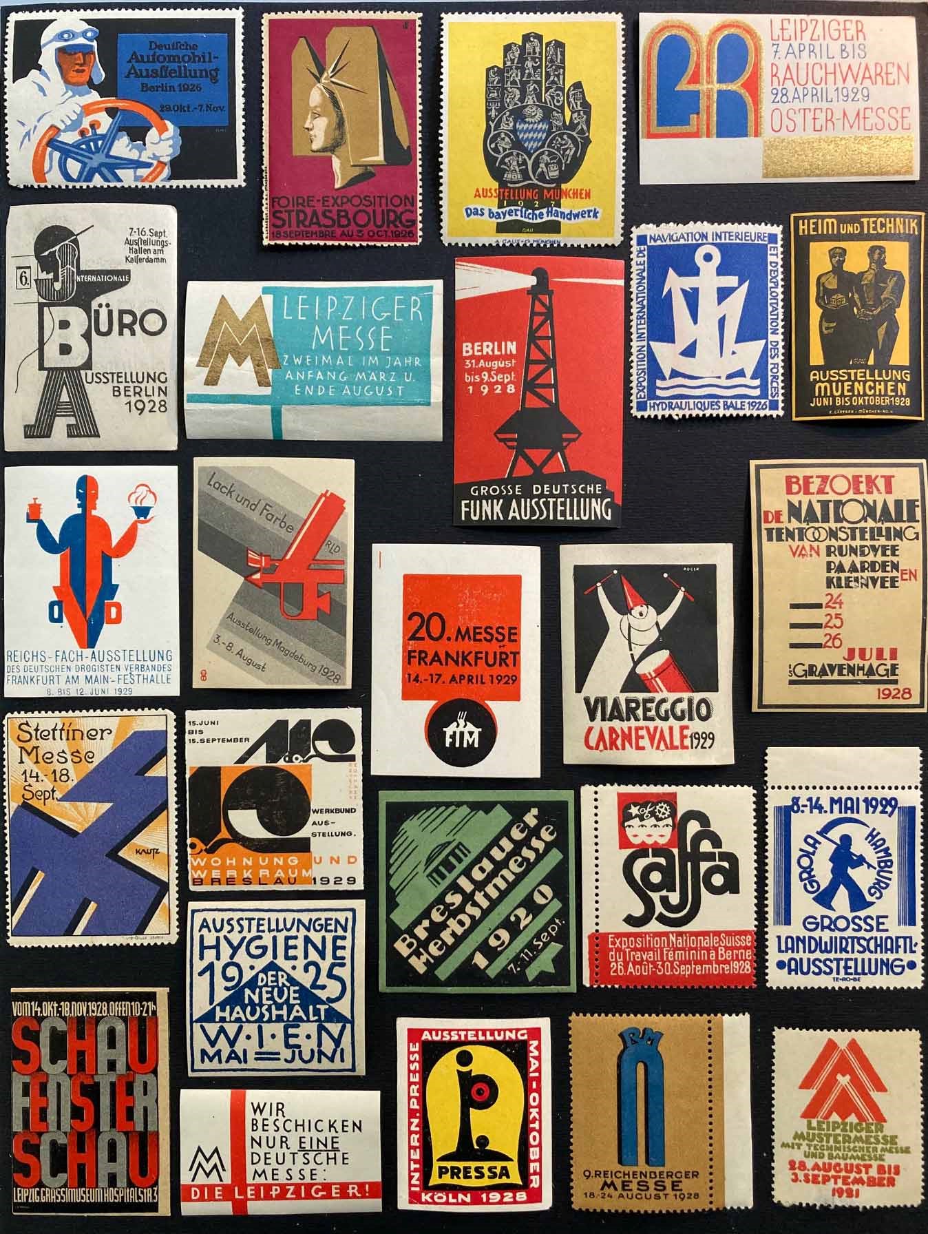 1920/1930, Erinnofilia, centinaia di etichette pubblicitarie, di manifestazioni automobilistiche, fieristiche, turistiche ecc., splendide per grafica e design della scuola Bauhaus e Futurismo. In eccellente stato, insieme non comune.
