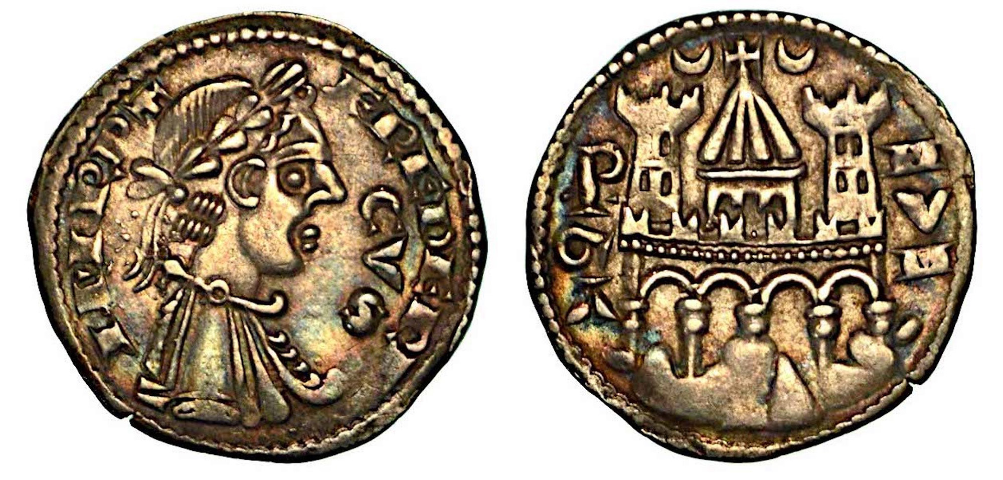 BERGAMO. Comune, a nome di Federico II (1194-1250)., Grosso da 4 denari, anni 1236-1250. Busto laureato a d. contorno perlinato. R/ Edificio centrale a tre archi con tetto a quattro spioventi. Al vertice, sfera e croce. Ai lati, due torri merlate a quattro finestre; sopra, due mezze lune. Alla base, quattro archi di mura merlate su terreno roccioso. CNB. 19. MIR.,17. Arg. g. 1,41. q.SPL
