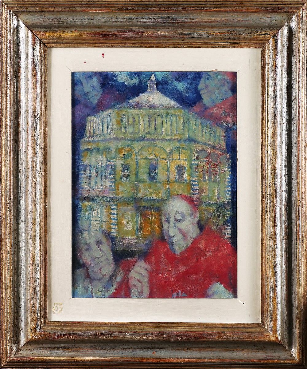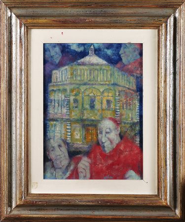 SQUILLANTINI REMO (1920 - 1996) Battistero. Olio su tavola. Cm 35,00 x 40,00. Frima in basso a destra. Al retro firma e titolo. Cornice presente