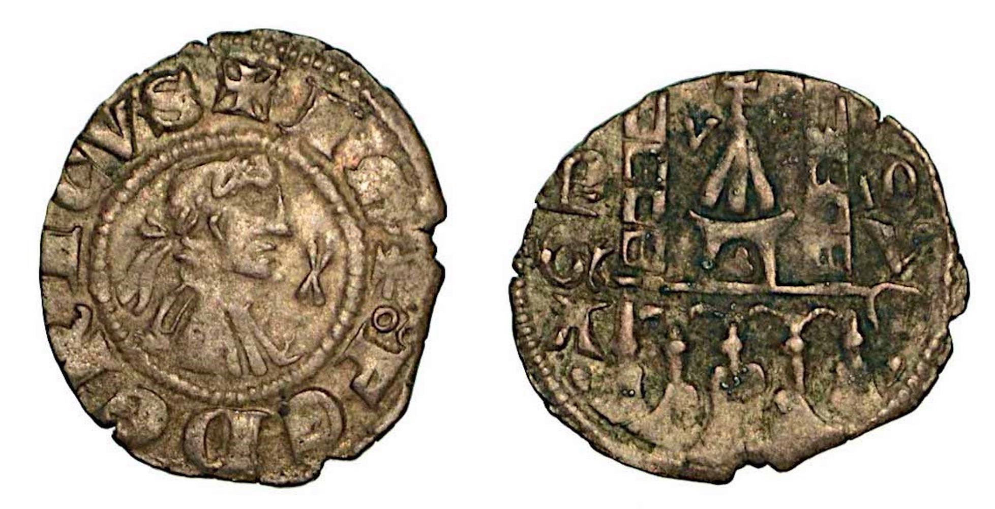 BERGAMO. Comune, a nome di Federico II (1194-1250)., Denaro planeto, anni 1270-1282. Busto laureato a d. in cerchio perlinato; nel campo a d. segno a forma di due cuori opposti. R/ Edificio centrale ad un arco con tetto a tre spioventi; sulla sinistra della cuspide, segno V. All'interno dell'arco, bisante. Al vertice, bisante e croce; ai lati, due torri merlate a cinque finestre. Alla base, quattro archi di mura su terreno roccioso. CNB. 126. MIR.,18. Mist. g. 0,93. MB/BB
