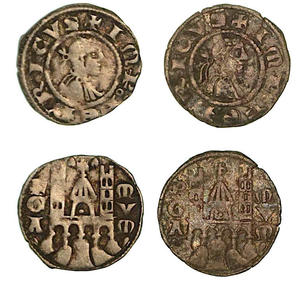 BERGAMO. Comune, a nome di Federico II (1194-1250)., Lotto di due esemplari. Denaro planeto, anni 1282-1290. Busto laureato a d. in cerchio perlinato. R/ Edificio centrale ad un arco con tetto a quattro spioventi. All'interno dell'arco, bisante. Al vertice, sfera e croce. Ai lati, due torri merlate a cinque finestre. Alla base, quattro archi di mura su terreno roccioso. CNB. 95. MIR. 18. Mist. g. 0,72 - 0,91. q.MB