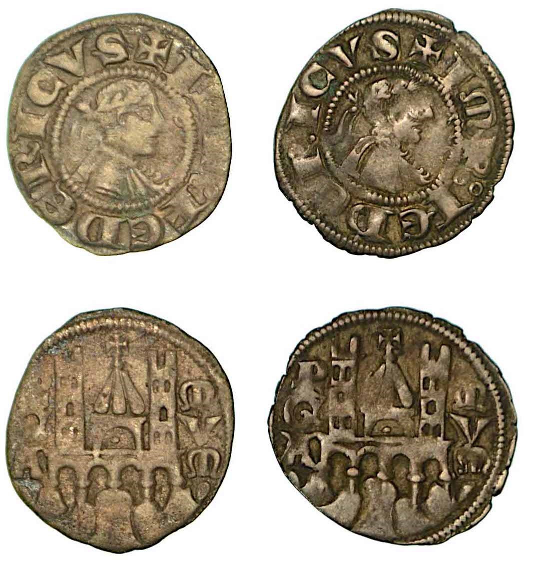 BERGAMO. Comune, a nome di Federico II (1194-1250)., Lotto di due esemplari. Denaro planeto, anni 1270-1282. Busto laureato a d. in cerchio perlinato, nel campo a d. tre cerchietti (poco visibili) aperti verso destra. R/ Edificio centrale ad un arco con tetto a tre spioventi; all'interno dell'arco, bisante. Al vertice, sfera e croce; ai lati, due torri merlate a cinque finestre. Alla base, quattro archi di mura su terreno roccioso. CNB. 131. MIR. 18. Mist. g. 0,70. 0,90. MB/BB; B/MB