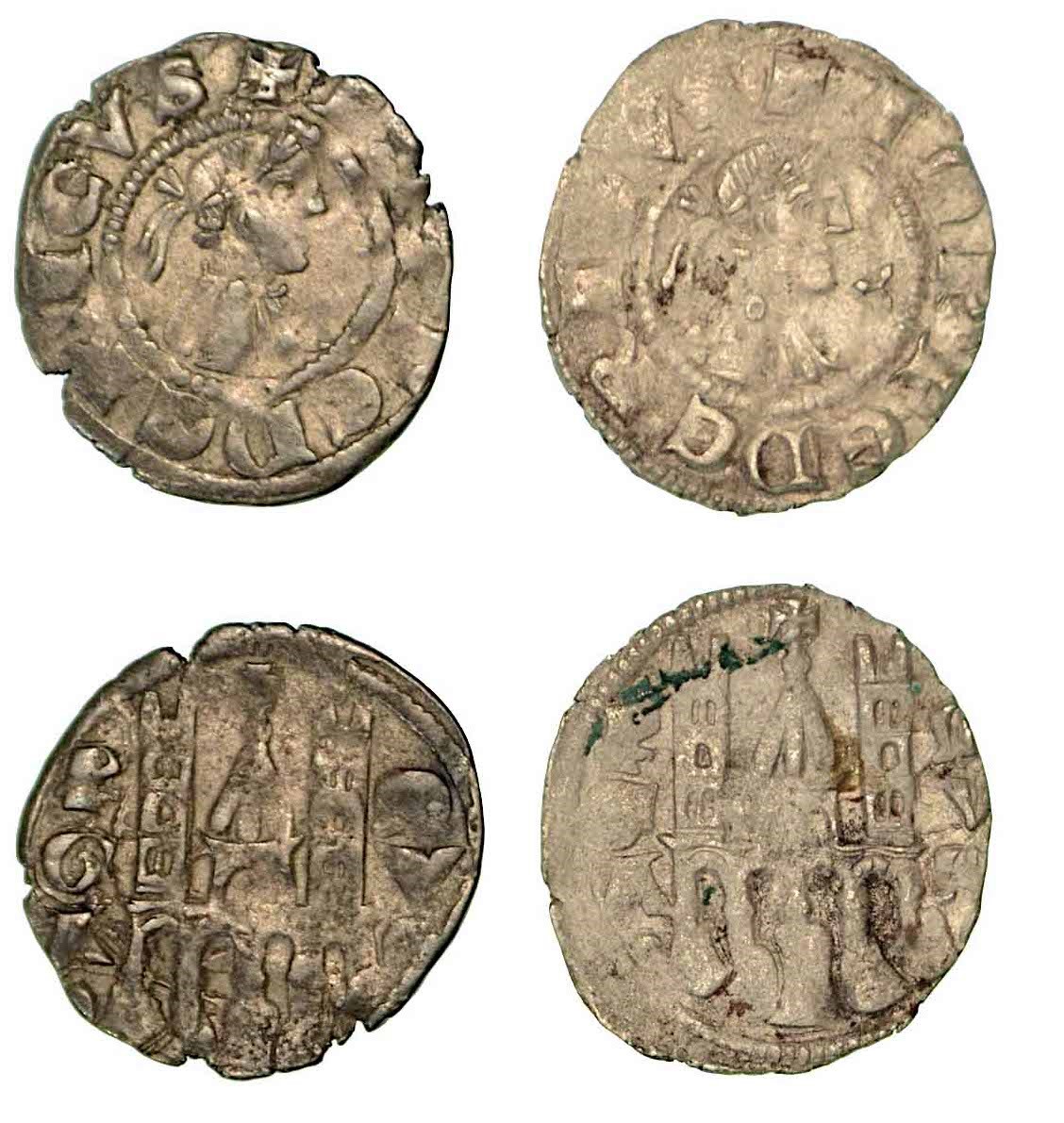 BERGAMO. Comune, a nome di Federico II (1194-1250)., Lotto di due esemplari. Denaro planeto, anni 1270-1282. Busto laureato a d. in cerchio perlinato, nel campo a d. tre losanghe. R/ Edificio centrale ad un arco con tetto a tre spioventi; all'interno dell'arco, bisante. Al vertice, sfera e croce; ai lati, due torri merlate a cinque finestre. Alla base, quattro archi di mura su terreno roccioso. CNB. 133. MIR. 18. Mist. g. 0,90 - 0,89. B/MB; MB