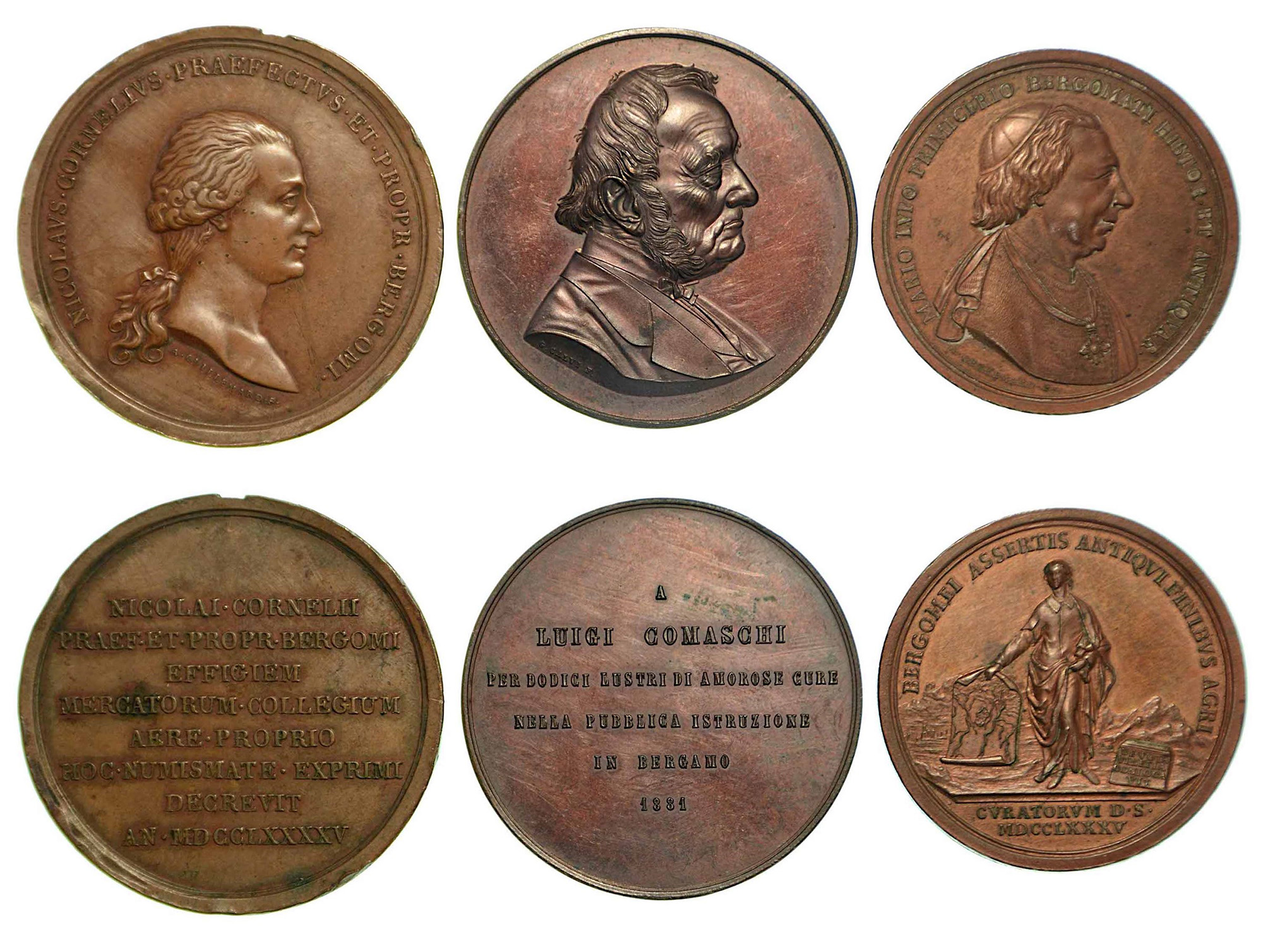 BERGAMO. Lotto di tre medaglie., Mario Lupi (umanista e storico), 1720-1789. Medaglia in bronzo 1785. Riconio. Busto a d. R/ Il Lupi stante presenta una carta geografica del territorio bergamasco. diam. 42. BB - Nicolò Corner (prefetto di Bergamo), fine XVIII secolo. Medaglia in bronzo 1795. Busto a d. R/ Legenda e data in otto righe. Opus A. Guillemard. Johnson 322. Colpi e appiccagnolo asportato. diam. mm. 48. MB/BB - Luigi Comaschi, 1792-1886. Medaglia in bronzo 1881. Busto a d. R/ Legenda e data in sei righe. C.V. 2158. diam. mm. 46. q.SPL