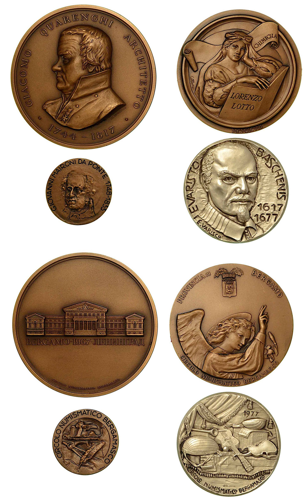 BERGAMO. Lotto di quattro medaglie (tre in bronzo e una in argento) del Circolo Numismatico di Bergamo., Sono raffigurati i seguenti soggetti: Evaristo Baschenis; Lorenzo Lotto; Giacomo Quarenghi; Giovanni Maironi da Ponte. SPL