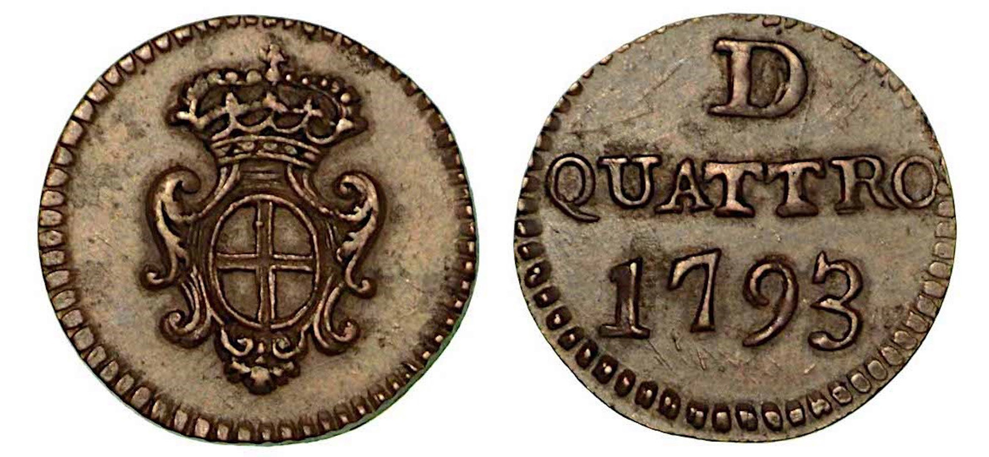 GENOVA. Dogi biennali, 1528-1797., Da 4 denari 1793. Stemma coronato. R/ Legenda e data in tre righe. CNI 31. Lunardi 359 (nota). MIR 360/1. Rame. g. 1,62. SPL